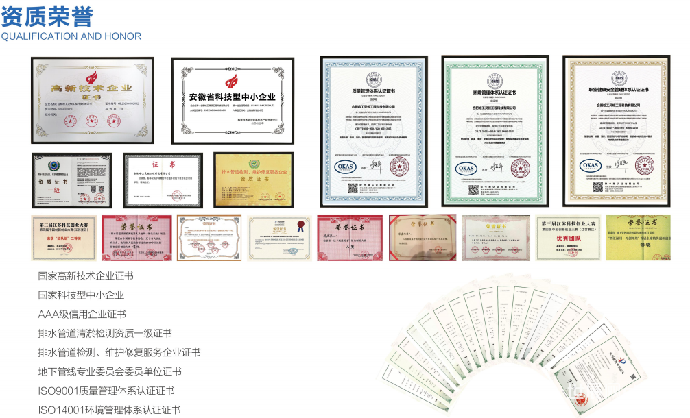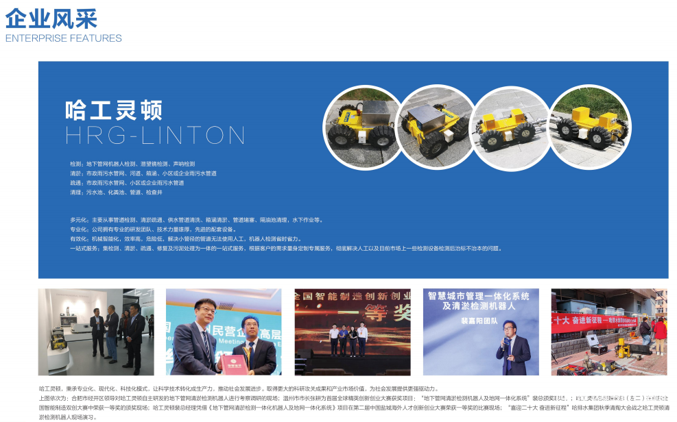 合肥哈工灵顿工程科技有限公司是一家以排水管网检测、评估、清淤、养护、修复等相关技术、高端智能装备研发制造为核心产业的国家高新技术企业,专注于为城市提供有效、智慧、环保的地下管网综合解决方案。公司集研发、生产、销售、服务为一体,经过多年的努力,成为地下管网行业领军企业。公司总部位于安徽合肥,研发团队是由美国哈佛大学、克莱蒙森大学、国内中科院沈阳自动化所、东北大学等十几位专家组成,都是行业内的高手。公司自主研发的小型地下管网清淤检测机器人、大型“通天龙”机械手、智能移动式装载平台、小型管道盾构机、铁路隧道清淤机器人、切管机等管网清淤的硬件产品,能解决雨污水管道95%以上的疑难杂症。在软件方面,公司研发出可覆盖城市所有排水管网的智慧信息平台系统,通过BIM仿真三维模型,结合实时上报数据,让整座城市的地下排水管网立体的、生动的,实时的展现在城市管理者的面前。服务方面,公司拥有自己的非开挖修复团队,精通管道翻转内衬修复技术、紫外光固化修复技术(CIPP)、原位热塑成型修复技术(FIPP)。经过多年的发展,聚焦自身的特业务,打造出了一支技术精湛、设备先进、施工作业能力强,经验丰富的“检测-清淤-修复。运维”全产业链服务队伍,服务于地下管线维护事业。