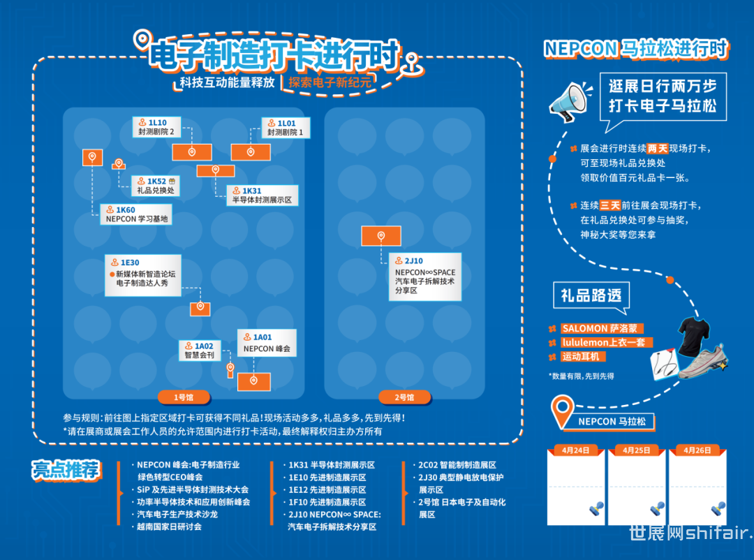 最后一日 展会福利大放送!众多好礼等你来选!在展会期间在为行业专业人士带来专业的学习和商贸交流机会外,还将开展极具趣味性的“电子制造打卡进行时!”、“NEPCON China:投资知识与未来的不二选择”等丰富观展体验。