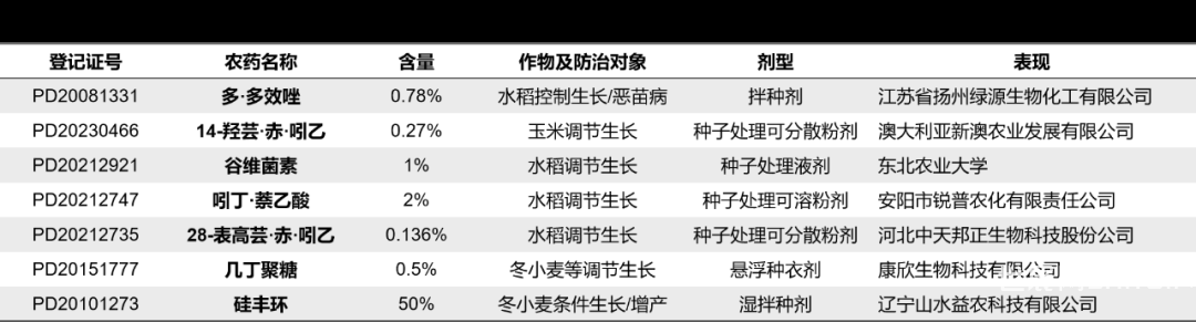 2、生长调节剂:生长调节剂目前国内登记种子处理的产品不多,但近几年推广用芸苔素内酯、赤霉酸·吲哚丁酸·芸苔素等进行种子处理的作物和区域较多。