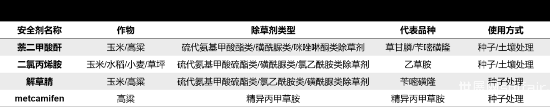 适用于种子包衣缓解除草剂药害的成分目前研究相对比较单一,主要还是集中在生长调节剂,比如赤霉酸、芸苔素内酯等等。虽然生长调节通过拌种对缓解除草剂药害是有效的,但相对于复杂的除草剂残留药害其效果并不显著。但通过生长调节剂与其他物质的混配不失为一个很好的研究方向。1、除草剂安全剂:通过种子处理来解决除草剂药害目前在国内没有查询到相关的应用案例。