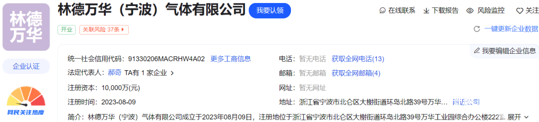 10、林德万华(福建)气体有限公司2023年7月18日,注册资金1亿元,经营范围包括一般项目:基础化学原料制造(不含危险化学品等许可类化学品的制造);专用化学产品销售(不含危险化学品);化工产品销售(不含许可类化工产品);气体、液体分离及纯净设备销售。由林德(中国)投资有限公司、万华化学(福建)有限公司共同持股,其中万华福建占股49%。而万华福建为万华化学控股子公司,占股80%。
