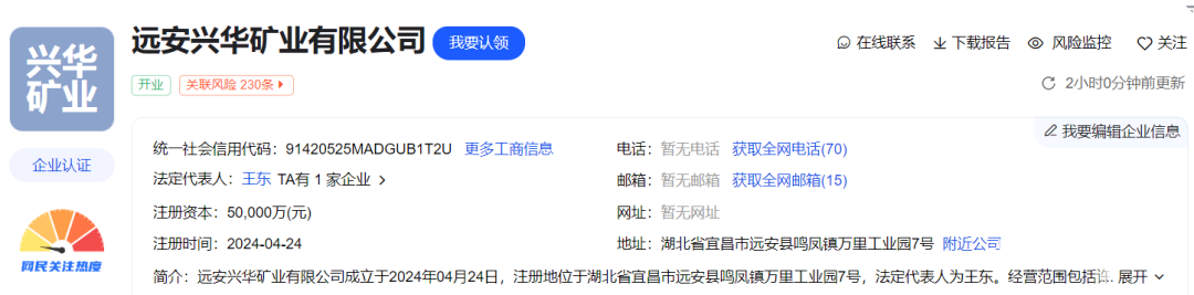 爱企查APP显示,2024年4月24日,远安兴华矿业有限公司成立,注册资本5亿元,经营范围包含:非煤矿山矿产资源开采;非金属矿物制品制造等。企查查股权穿透显示,该公司由兴发集团(600141)、万华化学(600309)、宜昌城发能源有限公司共同持股。其中万华化学控股40%。