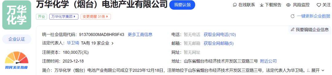 4、万华化学(烟台)电池产业有限公司2023年12月18日成立,注册资金18亿元,经营范围包括一般项目:以自有资金从事投资活动;电子专用材料研发;电子专用材料制造;电子专用材料销售;化工产品销售等。由万华化学电池科技公司、烟台中韬投资股份有限公司共同持股,其中万华化学电池科技公司占股80%。而万华化学电池科技有限公司为万华化学全资子公司。