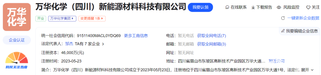 6、万华化学(四川)新能源材料科技有限公司2023年5月23日成立,注册资本为4.6亿元,经营范围包括:电子专用材料制造;电子专用材料研发;电子专用材料销售;基础化学原料制造等,也由万华化学(烟台)电池产业有限公司(简称“万华电池”)全资控股。