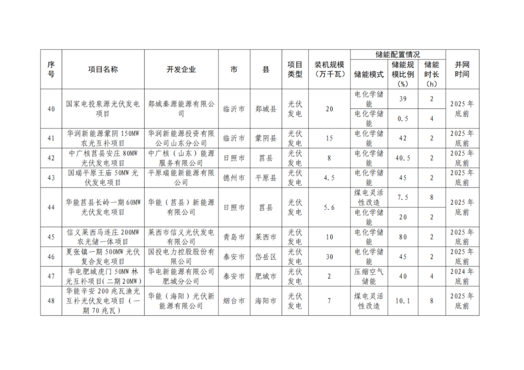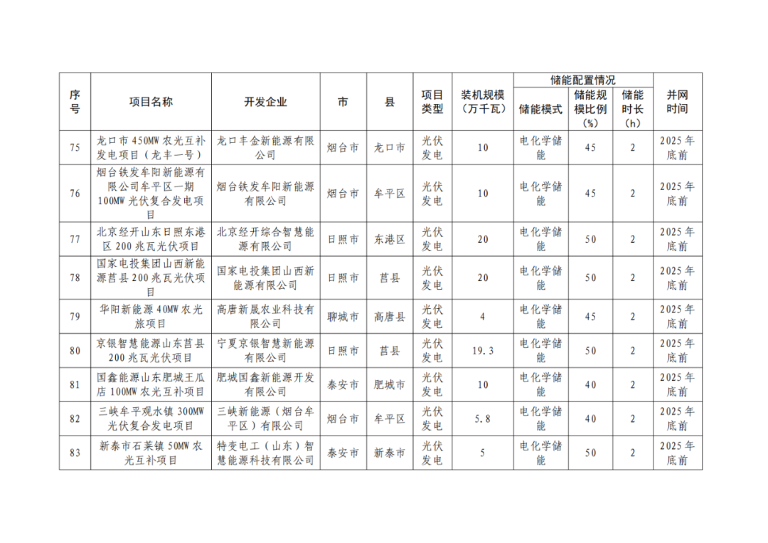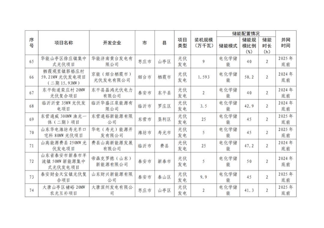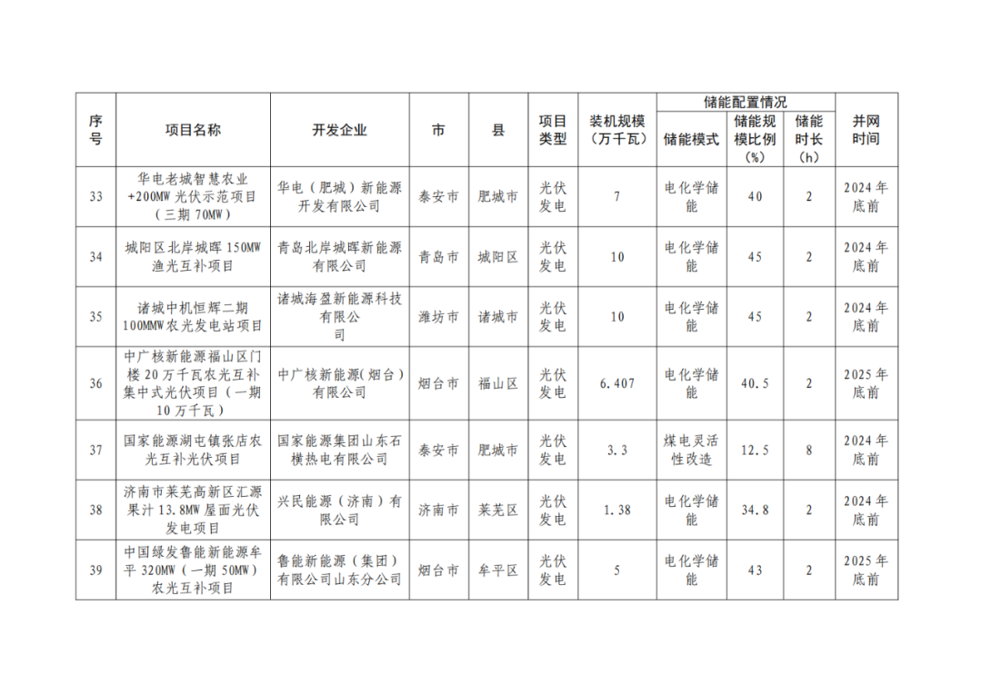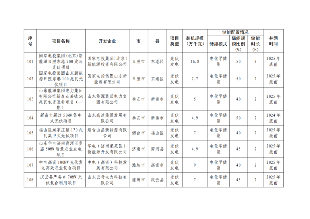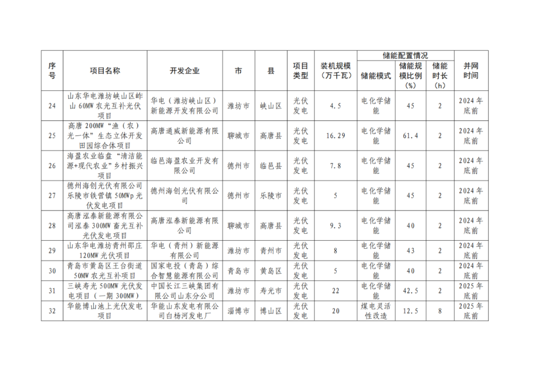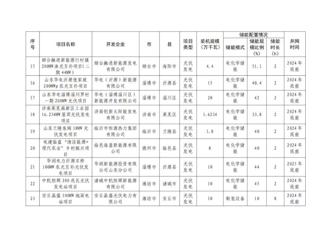 近日,山东省能源局公示2024年市场化并网项目名单,共公布了10.51GW的市场化项目。其中,风电项目1个,规模为50MW,光伏项目117个,规模合计10.46GW。项目共有4种配储方式,分别为电化学储能、煤电灵活性改造、压缩空气储能、制氢设备。从储能配置情况来看,其中,电化学储能:30~80%*2h;煤电灵活性改造:9~18.8%*8h。本次市场化项目合计配置储能情况如下:从项目所属集团来看,国家电投获得的规模最大,为1.68GW;其次为华电集团,也获得了1.48GW的项目指标,华能也获得了930MW的项目指标。具体情况如下: