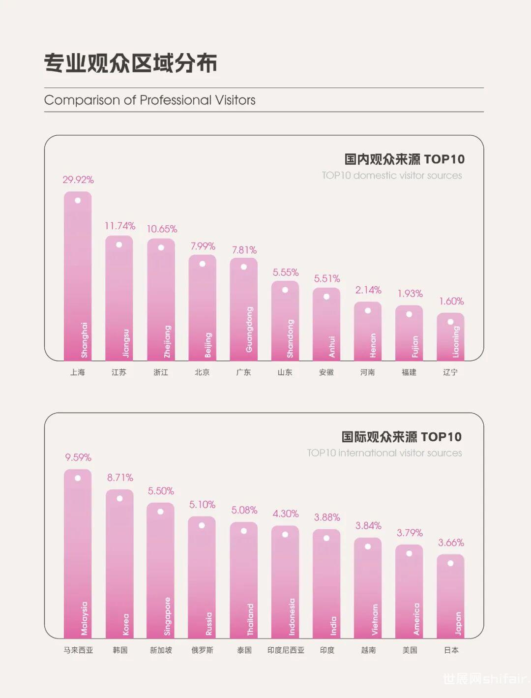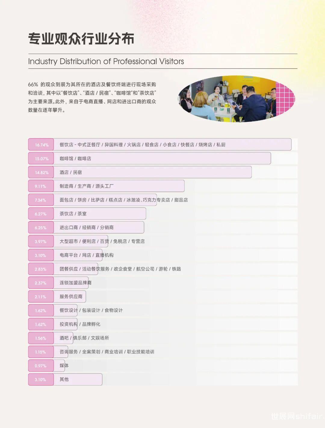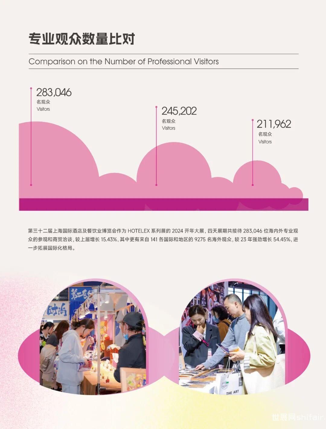 本届 HOTELEX 让我们望见了勃勃发展的业内生态,更看到了未来酒店餐饮业厚积薄发的产业蓝图。上海博华将继续以30多年深耕的行业经验,携手各界行业同仁,持续升级展览体系和服务体验,以会当凌绝顶,一览众山小的豪迈之志,诚邀大家继续携手共进,再启新征程!作为酒店餐饮行业展会的风向标2024 HOTELEX 上海展全新「展后报告」现已出炉本报告将通过专业数据为您洞悉市场动向与热点!行业蓝图徐徐展开让我们共同见证…在2024HOTELEX上海展4天的展期中,共接待观众28w+,其中,大部分观众是有采购需求的、来自酒店餐饮业的专业买家。今年的专业观众下单率高达94.71%,在成交量激增的同时,更多展商与专业观众建立了友好的商业合作关系。本届展会的港澳台观众数量有所提升,高达2525人,较去年增长32.48%。国际观众则来自141个国际和地区,较2023年强劲增长54.45%。海外不仅有来自周边的马来西亚、韩国、新加坡等东南亚国家的观众,也有大量来自美国、日本等国家的观众慕名前来观展。这场酒店餐饮行业的盛会,立足华东,遍至全球,呈现出全球餐饮业的澎湃生机及活力。