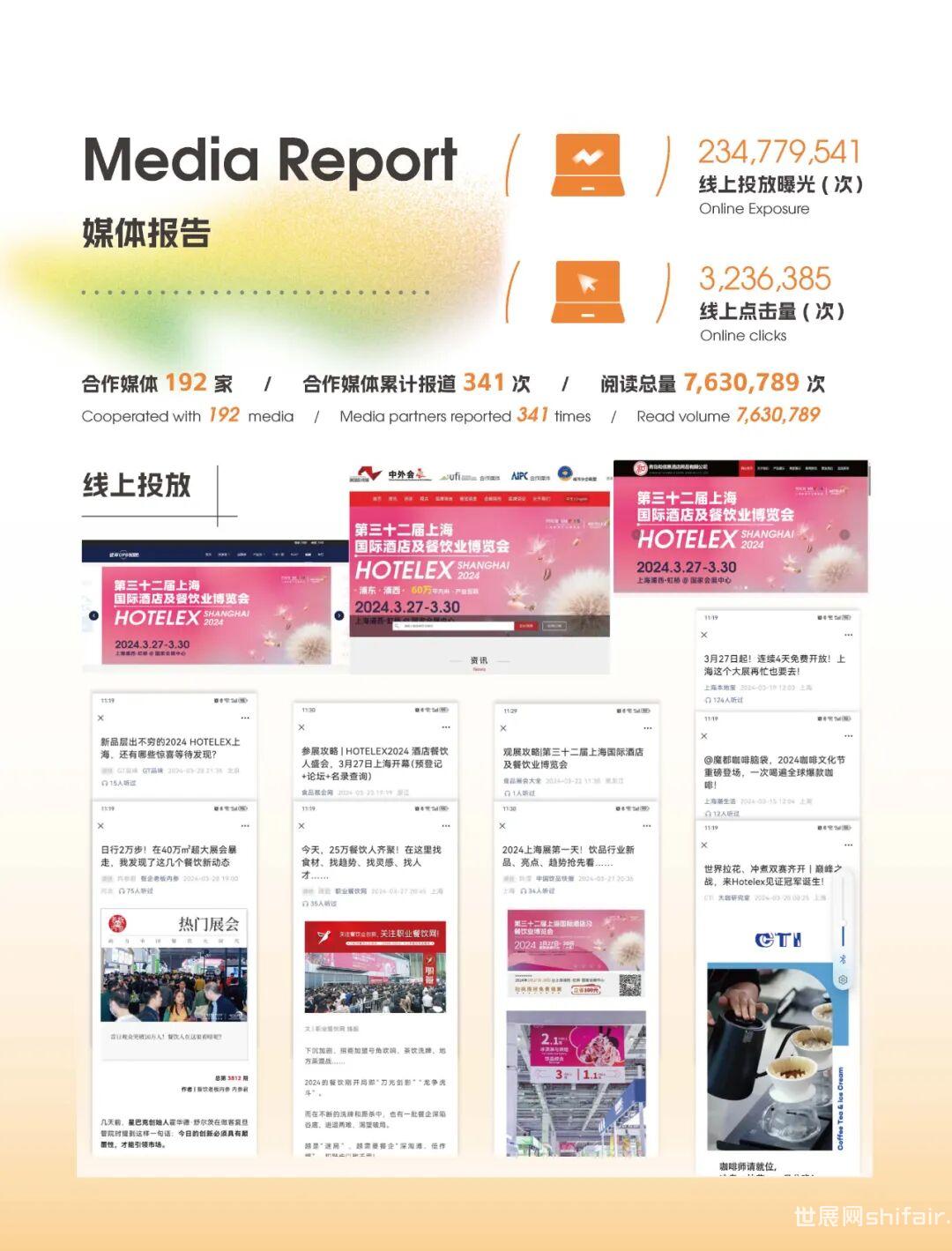 2024HOTELEX上海展采用线上线下双渠道投放的形式,结合传统媒体及新媒体等手段宣传。本届展会与餐饮界、职业餐饮网、餐饮老板内参等餐饮行业头部媒体达成合作,合作媒体高达190+。300+官方媒体、行业媒体、KOL等通过微信公众号、客户端、网站、抖音、小红书等渠道对展会进行了追踪报道。展会投放曝光突破2亿次,线上点击量达到了惊人的300w+。