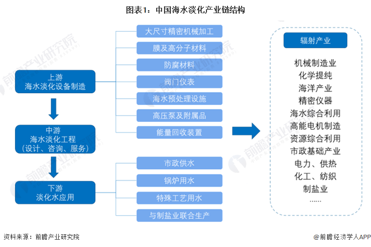 海水淡化产业链上游主要是海水淡化设备制造,包括膜及高分子材料、高压泵、能量回收装置等;中游则为开展海水淡化工程设计、咨询、服务的企业;海水淡化的下游应用主要在市政供水、工业用水等领域。