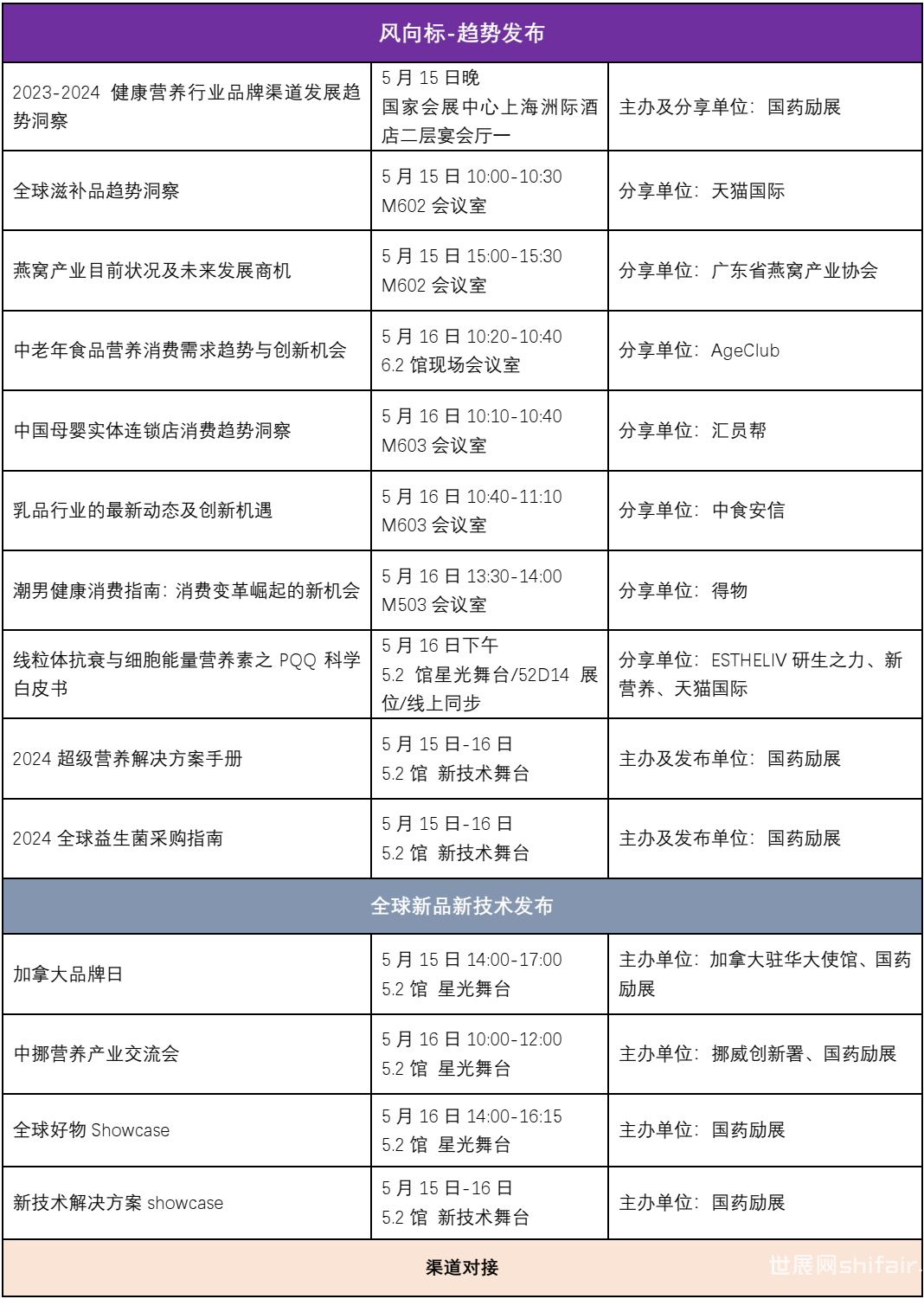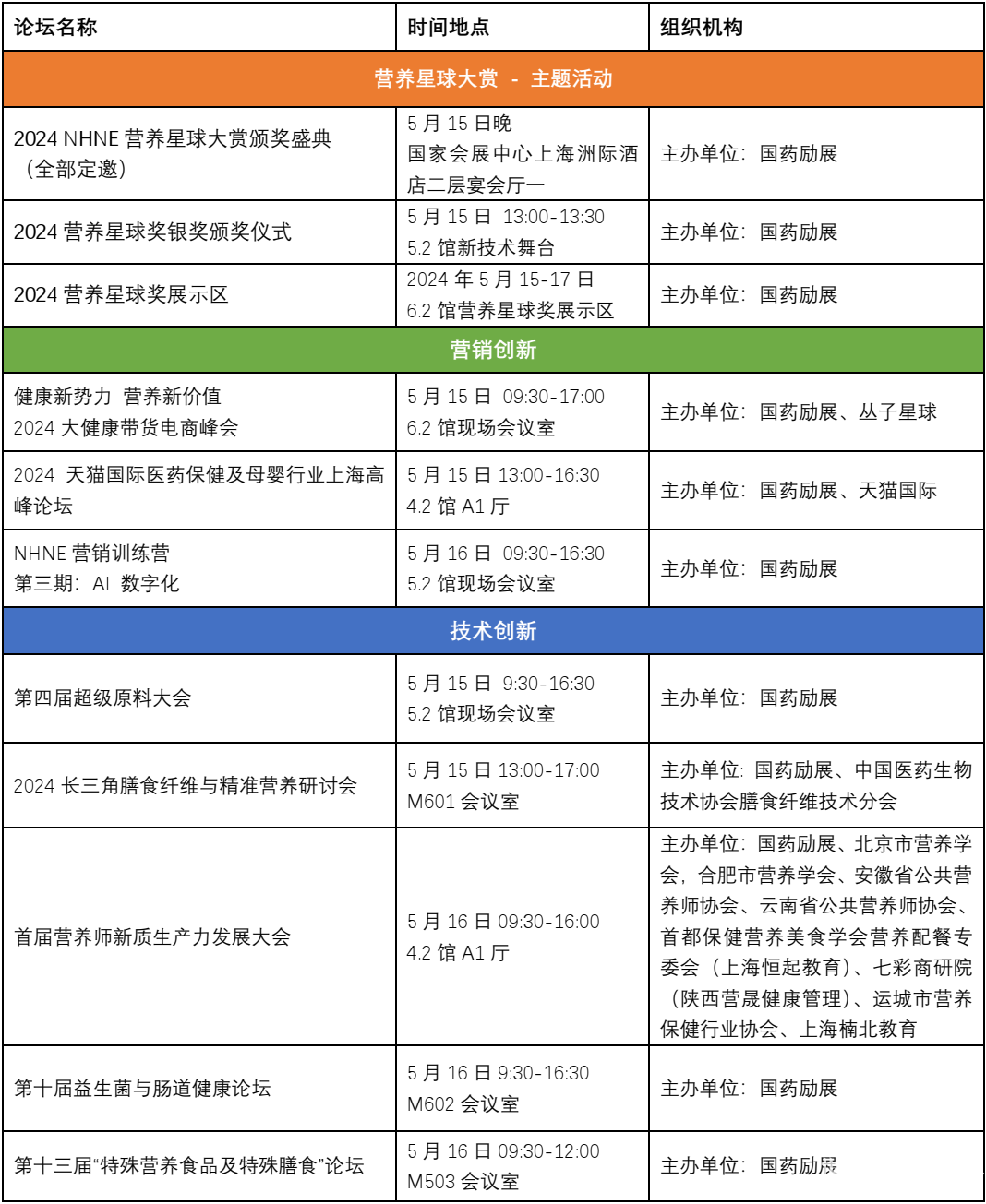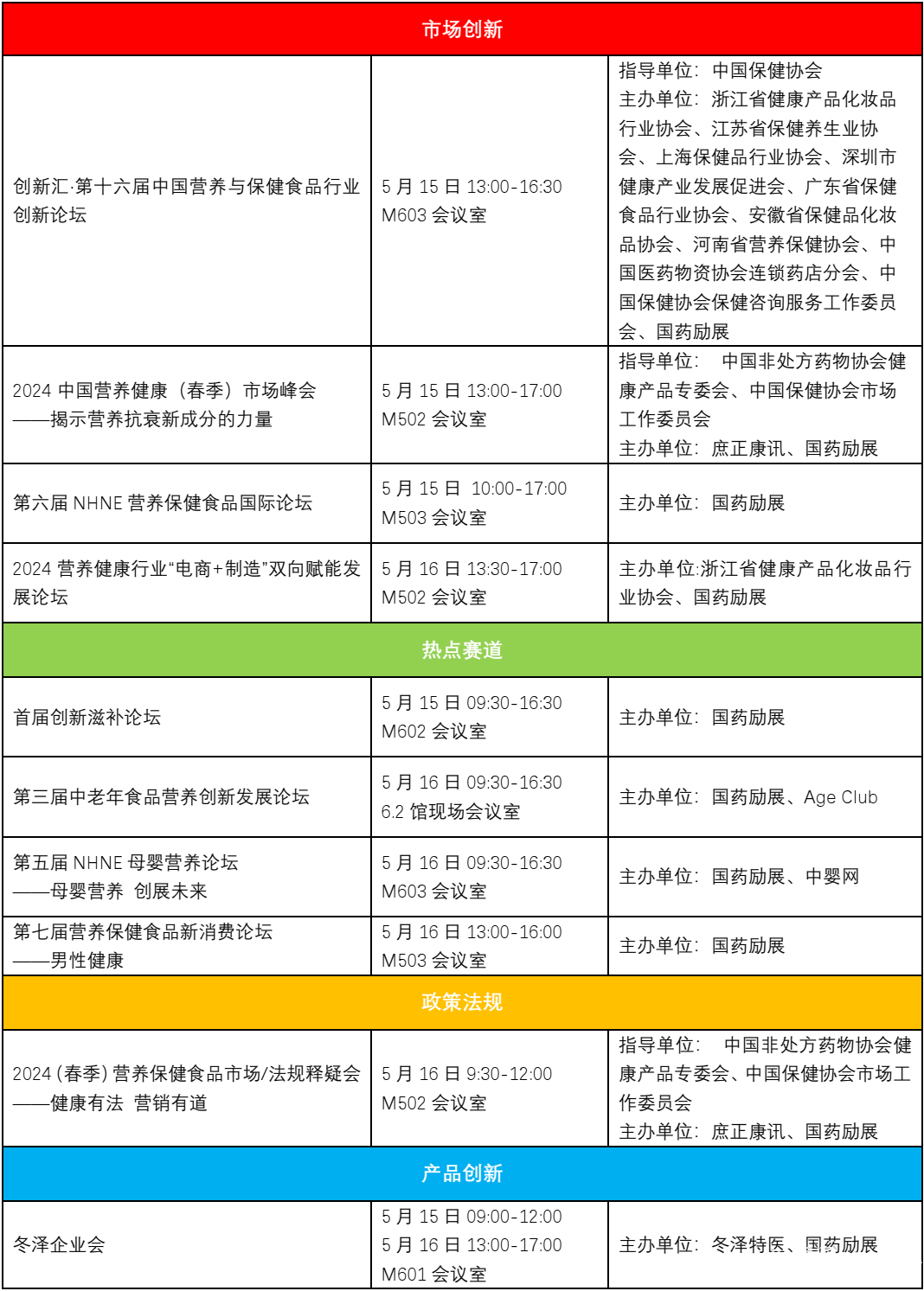 创新汇·第十六届中国营养与保健食品行业创新论坛论坛时间:5月15日13:00-16:30论坛地点:上海·国家会展中心M603会议室指导单位:中国保健协会主办单位:浙江省健康产品化妆品行业协会、江苏省保健养生业协会、上海保健品行业协会、深圳市健康产业发展促进会、广东省保健食品行业协会、安徽省保健品化妆品协会、河南省营养保健协会、中国医药物资协会连锁药店分会、中国保健协会保健咨询服务工作委员会、国药励展