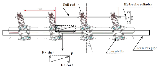 对所有原来的输出辊道进行了改造。在保证原辊道标高不变的前提下,在每个辊子机座上增加一个水平转台,并在该转台上安装原来的辊子传动系统即辊子、联轴器和减速电机。如前所述,将输出辊道分为三组,每组辊道通过拉杆相互连接,通过固定行程液压缸同步水平旋转和旋转角度α,如图3所示。当辊子体的中心轴线不垂直于钢管时,辊子体与钢管之间的静摩擦力F将沿钢管圆周方向和与钢管外表面相切方向产生一个分量F·sinα。它使钢管在辊道上一边向前一边旋转。热轧钢管的螺旋向前是保证其在加速冷却过程中不发生弯曲变形的必要条件。