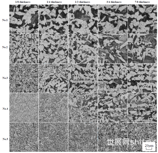 图5为光学显微镜下测试钢试样在厚度方向上不同位置的组织,依次为外表面1/8、1/4、1/2、3/4和7/8厚度。