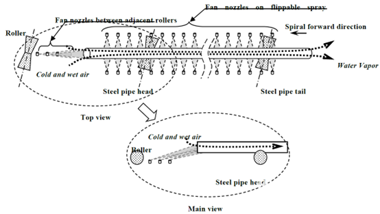 冷却介质为浊环水,取自该公司Φ460mm无缝钢管厂原来的供水系统。冷却水储存在中间水箱中,由水泵加压,保证冷却水的工作压力在0.3~0.4MPa之间。工作水温不应超过36℃。正常生产时,最大瞬时流量为500 M3/h。辊道电机由变频器控制,在冷却设备中控制钢管的运行速度和冷却时间。冷却水的工作压力由变频器控制的水泵电机控制。通过调节冷却时间和冷却水工作压力,可以控制钢管的降温程度。图4为钢管内外表面同时冷却的原理图。在可翻转的冷却装置大梁上安装了一些扇形喷嘴。在相邻的辊子之间安装了一些扇形喷嘴。通过可翻转冷却装置大梁上的扇形喷嘴喷水对钢管外表面进行冷却。通过相邻轧辊之间的扇形喷嘴喷射汽水雾化的水粒子流对钢管内表面进行强制冷却,不仅可以保证钢管纵向长度上的冷却均匀性,还可以改善钢管外表面水雾冷却的效率。