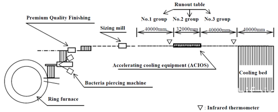 车间内加速冷却设备安装位置如图1所示。它被安装在热减定径机组和冷却床之间的辊道上。成品辊道总长110米,分为三组。1组与热减定径机组最后一组辊子相邻,长度为40米。2组辊道上配备了全套加速冷却装置,全长32米。3组与冷却床入口端相邻,长度为40米。在ACIOS入口和冷却床入口处分别安装红外测温仪,测量钢管温度。