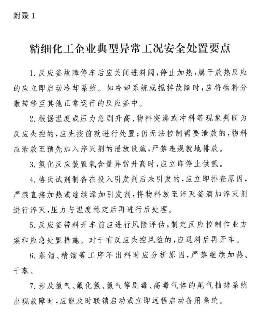 一、各地区应急管理部门和有关中央企业总部要认真落实化工和危险化学品安全生产治本攻坚三年行动方案,加强《处置准则》宣传培训,指导企业提高认识,深入理解、全面掌握《处置准则》要求,提升生产过程异常工况安全风险管控水平。二、各地区应急管理部门和有关中央企业总部要组织企业认真对照《处置准则》,建立健全异常工况处置制度,规范异常工况处置程序,提高生产过程异常工况安全处置能力。三、各地区应急管理部门要结合日常监管工作,强化对化工企业生产过程异常工况安全处置的监督指导,确保异常工况安全处置相关要求落地落实,发现违法违规行为的,依法严肃查处,防止和减少生产安全事故。化工企业生产过程异常工况安全处置准则(试行)1 目的为进一步规范和加强化工企业生产过程异常工况安全风险管控,提高异常工况安全处置意识和能力,指导企业科学稳妥应对防止和减少生产安全事故,制定本准则。2 适用范围本准则适用于化工企业生产运行阶段的装置开停车、非计划检维修、操作参数异常、非正常操作或设备设施故障及其他存在能量意外释放风险的情况。3 基本要求3.1企业应在日常工作中,对照异常工况情形,进行风险评估,建立或明确紧急处置程序,开展培训和演练。3.2紧急处置程序应至少包括:处置步、安全措施、停车条件。3.3紧急处置时,企业未开展评估和进行审批,不得摘除或旁路联锁以强制维持设备或装置运行。3.4企业应建立完善岗位人员紧急停车、人员撤离等授权机制。3.5装置联锁触发后应及时查明原因,并逐一消除联锁触发条件,严禁强行复位。3.6必须及时响应装置所有报警。可燃气体和有毒气体检测、火灾报警系统报警后,严禁不分析原因、不到现场确认随意消除报警。3.7动火、受限空间、设备或管线打开等作业,企业应按照规定办理作业审批。4 处置原则4.1及时退守到安全状态4.1.1发生以下情形时,应按紧急处置程序及时退守到安全状态:(1)操作单元出现飞温、压力骤变、爆聚、沸溢、管线堵塞、介质互串、搅拌失效、设备剧烈振动等异常情况的。(2)安全阀、爆破片等紧急泄压设施异常启动,原因不明、无法恢复正常的。(3)关键设备故障、重要的公用工程(水电汽风)中断、仪表控制系统故障等,原因不明、无法恢复正常的。(4)易燃易爆、高毒剧毒介质明显泄漏,存在失控风险的。(5)发生地震、台风、强降雨等自然灾害,不能保证正常生产的,安全退守方式包括但不限于:全装置停车、局部停车、停止加热、紧急冷却、停止进料、终止反应、卸料泄压、单元隔离等。4.1.2装置出现未预先研判出且无紧急处置程序的异常工况,应第一时间停车。4.2现场处置人员最少化4.2.1当现场情况不明时,在未进行安全风险评估且未采取安全防护措施的情况下,任何人不得进入现场。初步确定现场可进入后,最多2人佩戴必要的防护装备、报警仪及相关安全工具后进入现场进一步侦查情况。4.2.2处置过程中应严格管控现场人员,明确责任分工,按最少化原则控制现场作业人员数量。严禁与处置无关的人员进入作业区域。4.2.3现场处置时,同一部位原则上不得进行交叉作业,同一装置区内一般应为2人,最多不得超过6人。4.2.4指挥人员应尽可能使用视频、无线电通讯等设备进行远程调度指挥。4.2.5应采用视频监控、电子围栏、基于人员定位系统的人员聚集风险监测预警等信息化数字化技术,强化处置现场人员聚集风险管控。4.3全面辨识分析风险稳妥处置4.3.1处置前应全面分析研判处置过程的安全风险,制定落实有效管控措施,严禁在风险不明或不可控的情况下盲目处置。4.3.2处置管线、阀门等堵塞情况时,应根据堵塞物的特性设备管线的设计条件、疏通介质的特性等综合考虑疏通方式,禁止蛮干。处置撞击敏感度高的堵塞物时,严禁外力敲击。4.3.3严格作业安全条件确认,严禁仅把“目视、鼻、耳听、手摸”等作为最终安全条件确认的手段。确认方式包括但不限于:(1)泄压结束的确认,如观察现场压力表的指针升降过程或者DCS上压力变化曲线、通过两套或以上不同形式的压力监测系统比对确认、根据物料危险特性微开导淋或放空阀确认等。(2)容器、管线能量隔离有效性的确认,如盲板是否按要求加装、放空导淋是否全部打开、连接管线是否已经断开等。(3)电气设备断电确认,如断电后开关柜上锁挂牌、现场进行点试、使用仪表进行带电检测、将断路器(抽屉)拉至检修位(试验位)、拉开隔离开关、摘除保险等。(4)进入受限空间前使用符合相关标准的检测仪器进行有代表性、全面性气体检测,有条件的可以使用便携式检测仪和实验室取样分析比对确认。4.3.4处置人员应根据现场物料的特性和潜在的风险,佩戴完备有效的个体防护装备。4.4有效防止能量意外释放4.4.1处置作业过程中涉及管线、设备打开时,应将拆装部位前后端泄压、吹扫置换并与运行系统有效物理隔离,严禁以水封或关闭阀门代替加装盲板。4.4.2处置作业过程中非必要不得进行带压密封和带压开孔作业。应急处置中确需进行的,企业应开展作业可行性评估,勘测现场环境和设备状况,制定专项作业方案。4.4.3严禁在毒性程度为极度危害介质的设备、管线上进行带压作业;严禁在未进行测厚、无法有效阻止材料裂纹继续扩展结构和材料的刚度及强度不满足安全要求
