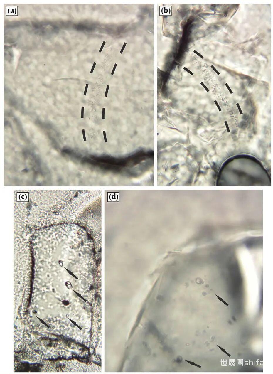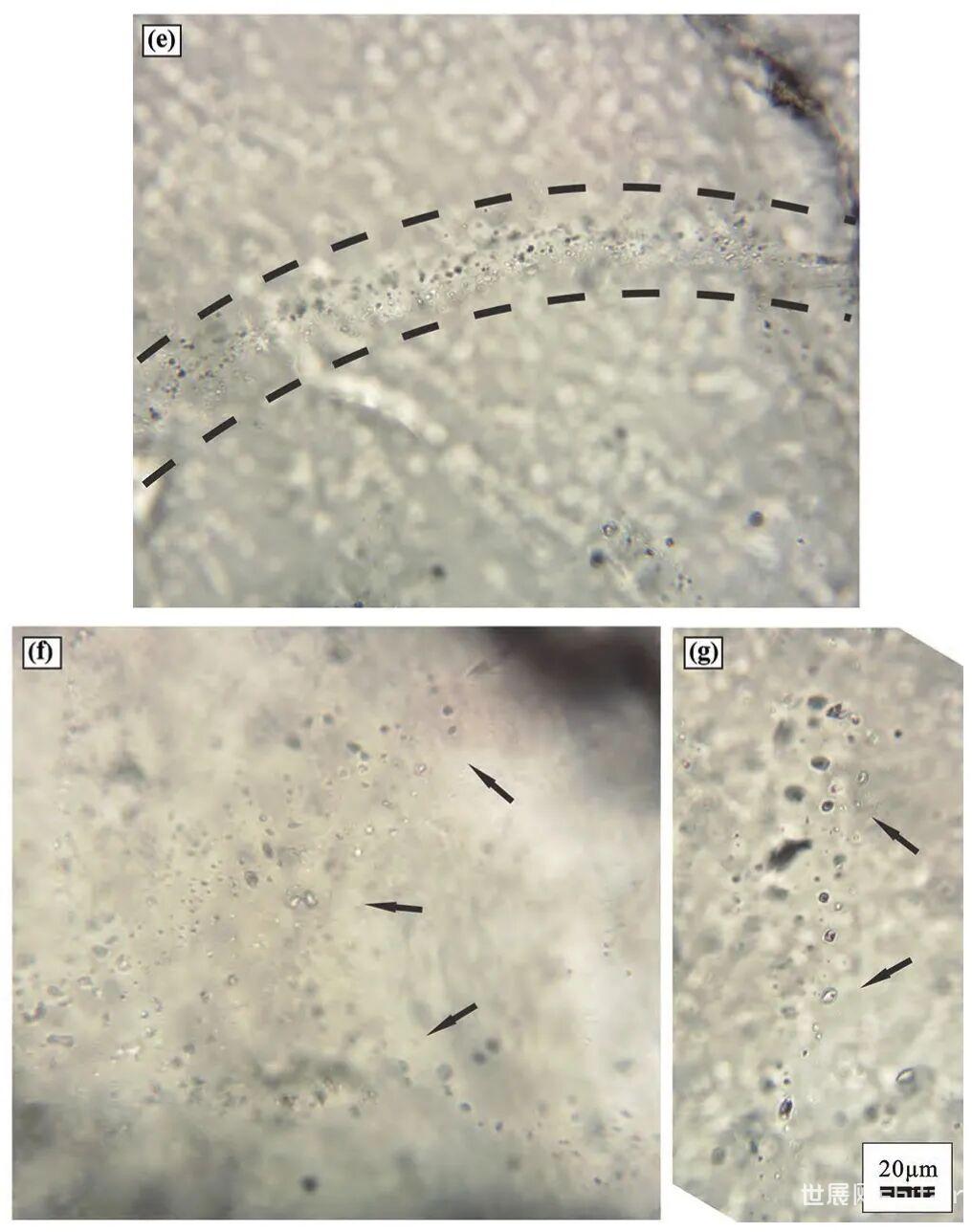 东海变质岩石英中的包裹体(×100):含CO2包裹体,呈群带状分布