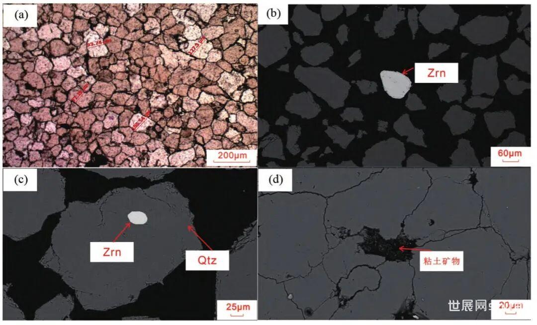 青海石英岩中包裹体形态特征(采自青海省西宁市大通县李家山镇花脖湾地区)a、b为偏光显微镜(正交光)下的显微形貌,c、d为扫描电镜下的石英微观形貌相较于脉石英,青海石英岩中石英晶粒内气液包裹体的数量稍少,呈浑圆状稀疏均匀分布,粒径范围在5~15μm,由于经历了较强的构造应力作用,相当部分的气液包裹体已经被破坏;固态包裹体含量有显著增加,粒径也较大,甚至达到50μm,包裹的矿物主要为白云母、金红石,另含少量铁质矿物。11、江油石英砂岩