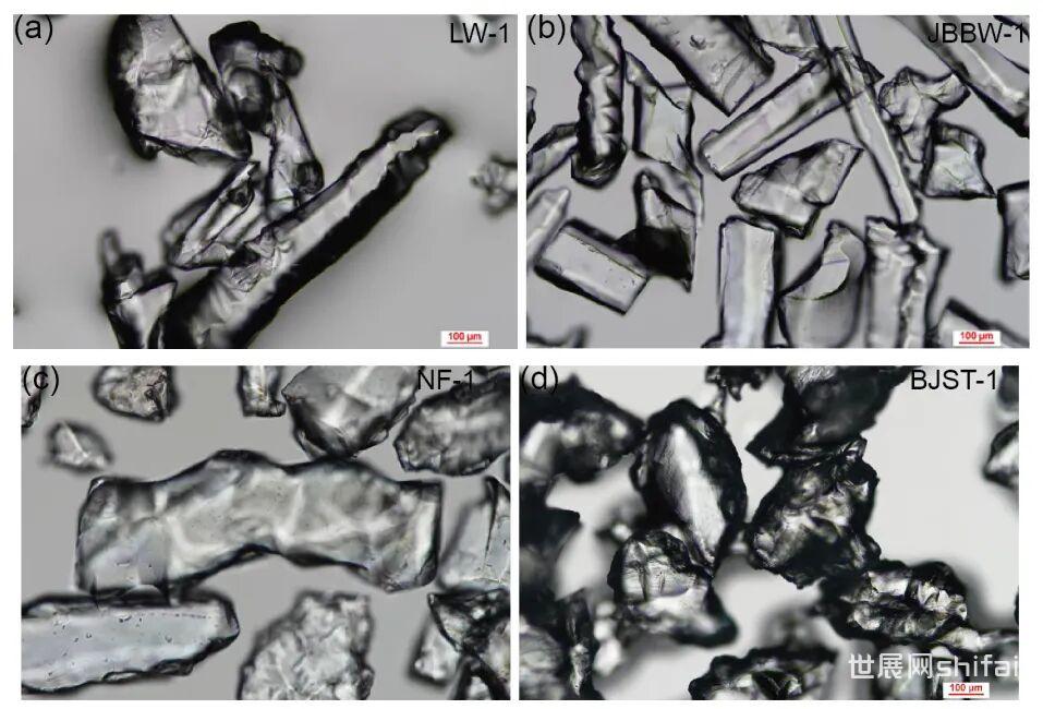 老挝LW-1、津巴布韦JBBW-1、南非NF-1和巴基斯坦BJST-1脉石英精制石英砂内部包裹体特征对4件脉石英原矿制得的精制石英砂进行显微观察,经过提纯后的精制石英砂,内部包裹体较少,较纯净,但部分石英砂样品仍残留一定包裹体,可能是精制石英砂中杂质元素Na和Ca的主要来源。4种脉石英原矿粒径均为粗粒,老挝LW-1与津巴布韦JBBW-1脉石英气液流体包裹体含量极低,所有样品包裹体均主要以表面和晶粒交界处的流体包裹体为主,主要成分为CO2和H2O,这类流体包裹体后期比较容易通过加工提纯去除。提纯后的精制石英砂内部包裹体较少,较纯净。4种脉石英原矿制得的精制石英砂的SiO2含量均基本达到99.99wt.%,主要杂质元素为Li、Al、Ca和Ti,后期可以进一步通过高温氯化进行去除。9、青海脉石英