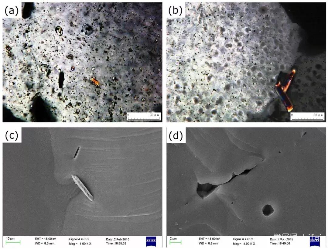 青海脉石英中包裹体特征(采自青海省海西州大柴旦行委黑石山-塔塔凌河一带的花岗伟晶岩脉中)a、b为偏光显微镜(正交光)下的显微形貌,c、d为扫描电镜下的石英微观形貌在青海脉石英中发现,几乎所有的石英晶粒内部含有大量包裹体,气液相约占70%,固态包裹体约占30%,总体成群分布,局部线状排布,少量孤立或稀疏分布。气液包裹体形态主要有浑圆、三角、不规则状三类,粒径范围在0.5-25μm,多集中于2~10μm;大部分固态包裹体可能为同生包裹体,包裹的矿物可能为白云母、金红石和铁质矿物。10、青海石英岩