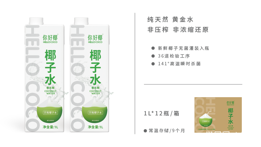 你好椰 选取上等好椰,100%天然椰子水,取之大自然的水还原大自然的味道。0脂肪,0胆固醇,天然补水零负担。传统海南的椰子因为品种或其他原因,椰子水中总有“玉米须味”,为了解决这个问题,我们经历了上百次的研发调试,最终,以泰国香水椰结合海南椰子,并在初加工阶段就把椰子油进行分离,在最大程度保留椰子天然香气的同时使产品更加清爽可口,这样无论是直接饮用或是搭配咖啡、茶饮水果等,都很融合。