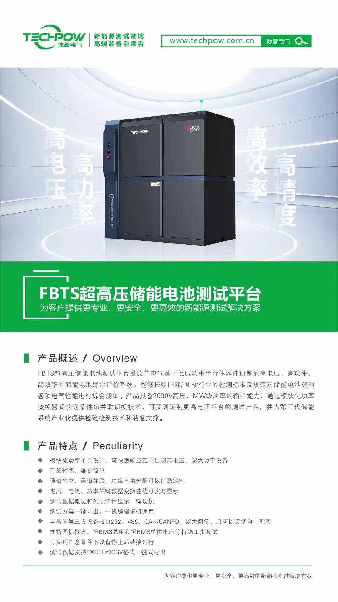 在这场享誉全球的科技盛会,德普电气重点展示了FBTS-CE04-1500精密型储能电池测试平台、FBTS-E04-3000超高压储能电池测试平台、FBTS-E04-1000动力电池系统高压超充检测设备等创新成果,助力电池技术发展与新能源产业升级,吸引了众多行业专家与观众驻足观看,零距离感受研发实力,引发行业高度关注。其中,精密型储能电池测试平台、超高压储能电池测试平台等重磅新品更是备受瞩目。创新产品 展示企业硬实力