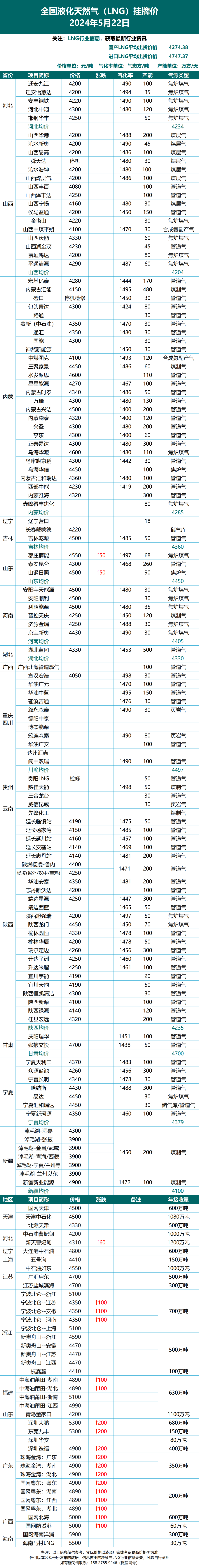 今日行情近期国际LNG现货价格持续高位运行,受成本支撑再加上大型液厂湖北黄冈液厂今日(5月22日)停止装车一天,利好周边资源出货。今日海气价格集中上涨,涨幅达200元/吨。国产气方面,随着近期LNG价格连续回落,低价LNG出货有所好转。但目前下游需求低迷,高价LNG出货压力仍存,预计短期内低价回稳,高价补跌。了解实时价格动态,可关注本文最下端留言处欢迎各液厂/接收站在本平台报价+微信:lngnews2019
