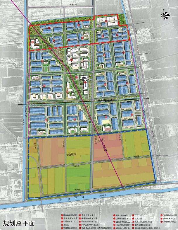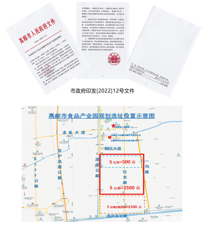 高邮市食品产业园选址于龙虬镇南,北至李家庄庄台路(横一河),东至一沟路(朱庄河),南至头闸干渠北路(头闸干渠河),西至澄营公路(澄潼河),形成小“四河四路”,总体规划面积约4000亩,其中近期建设用地面积约500亩,中远期建设地面积约2000亩,其他为控制发展区域约1500亩。中远期建设按照土地调整到位情况以及园区发展情况,分步适时实施。打造“含税”农业,带动农民致富,助推乡村振兴。
