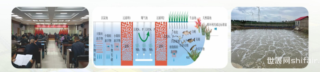 园区坚持“好水养好虾”的理念,坚守“生态优先、绿色发展”的底线,彻底改变过去一味追求“高蛋白、高密度、高投放”的固守传统思维,全面实行“两降一禁”的生态养殖模式,创新使用源水处理、生态养殖、尾水处理等模式,改变过去的养殖用水“直进直排”的粗放式模式,建设独立的进排水渠道、进出水口、提升泵站,实现养殖用水全程处理,尾水全部达标排放、循环利用。园区源水处理区和尾水处理区总面积约380亩,约占园区总面积的18%。东、中、西区分别设置源水处理区,从主进水口通过提升泵站将水源引入源水净化区,集中静置消毒后再通过进水管道,排入养殖棚内。养殖周期结束后,大棚外围的排水明渠承担了沉淀池的功能,再经过曝气池、生态净化池以及两个过滤坝的“三池两坝”处理模式,经检测合格后直接排放至园区内河,实现循环利用。
