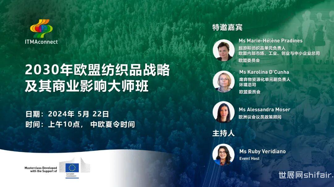 在本期《2030年欧盟纺织品战略及其商业影响大师班》中,我们将深入探讨最新出台的欧盟劳工立法。此法规是欧盟为维护劳动者,同时促进全球供应链的可持续性发展而制定。在新规实施后,纺织行业的供应链将因此深受影响。企业须严格遵守法规,否则商品将无法进入欧盟27个成员国。您可通过此大师班了解该立法、激活时间表以及企业需要做哪些准备。大师班特别嘉宾: 日期:2024年 5月 23日 时间:上午10点, 中欧夏令时间获悉欧盟纺织立法的四大支柱将如何共同推动纺织业的可持续和循环经济,您可在#ITMAconnect视频点播平台上观看《2030年欧盟纺织品战略及其商业影响大师班》线上发布会视频。