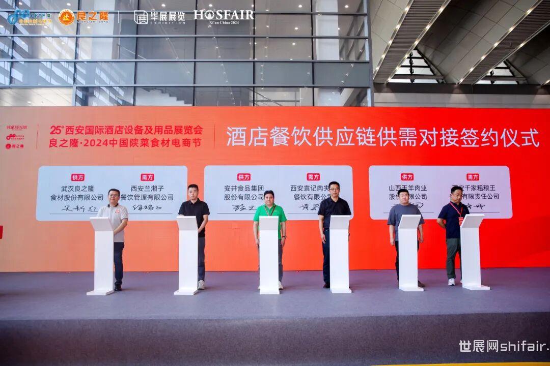 武汉良之隆食材股份有限公司董事长 良之隆·中国食材电商节创始人朱长良广州华展展览有限公司总经理 西安华展展览有限公司董事长王志接着举办了餐饮供应链供需对接、酒店设备及用品供需对接六轮签约仪式,武汉良之隆食材股份有限公司与西安兰湘子餐饮管理有限公司、安井食品集团股份有限公司与西安袁记肉夹馍餐饮有限公司、山西玉羊肉业股份有限公司与西安千家粗粮王餐饮有限责任公司,以及陕西雅兰纺织集团有限公司与西安古都文化大酒店、陕西民旅实业发展有限公司与西安东方大酒店、陕西汇丰厨房设备工程有限公司与西安灞柳驿酒店分别进行了现场签约。