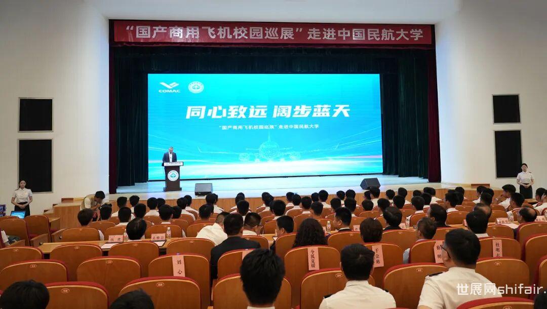 此次巡展活动,中国商飞公司首次携C919飞机进校园,为广大师生提供亲身体验国产大飞机、深入了解国产大飞机的机会。中国商飞公司党委副书记、董事谭万庚,中国民航大学党委书记曹胜利,校长丁水汀,副校长杨虎,中国民用航空华北地区空中交通管理局天津分局局长王蔚,天津滨海国际机场有限公司副总经理王颢哲出席开幕式。曹胜利在致辞中指出,大飞机的研制历程是一部感人至深的奋斗史。中国民航大学始终坚守建民航、兴民航、强民航的初心使命,秉承民航运输业和航空制造业两业融合的理念,积极融入国家和行业发展大局。从黄浦江畔到渤海之滨,中国民航大学与中国商飞公司在人才培养、科技合作、教育培训、成果转化等方面建立了长期稳定全面的合作关系。希望以此次活动为契机,与中国商飞公司持续加强创新链、人才链、产业链深度融合,推动产学研协同发展,共同打造民航战略科技力量,为谱写交通强国建设民航新篇章作出更大贡献。谭万庚对中国民航大学长期以来的支持表示感谢,向关心和支持大飞机事业的广大师生表示敬意。他指出,中国民航大学作为我国民航人才培养的最高学府,为民航系统培养了大批专业技术和科技创新人才。随着国产飞机运营生态日益繁荣,公司与中国民航大学在人才交流等方面的合作日益加强,600多名中国民航大学的毕业生活跃在国产大飞机项目研制、运行支持一线。衷心希望各位“准民航人”能接续奋斗,把学识专长和职业发展与民航强国战略、大飞机战略紧密结合,为提升国产民机竞争力、推动发展新质生产力作出新贡献。