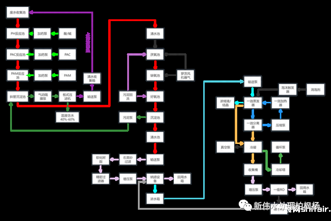 预处理:机械过滤,原水为经过物化+生化处理的中水中水回用:超滤+一段抗污染RO膜+二段DTRO膜+二级低压RO膜+EDI装置蒸发结晶:浓缩液(超浓水箱)根据需要选用MVR蒸发结晶装置或多效蒸发器。写在最后(吐槽):工业废水项目,有时候经验比理论都重要。前期需要”深刻理解”客户或者环评报告的思路及要求,调试及运行阶段还要时刻面对废水多变的水质,必要的备用池,备用设备需要充分考虑,可能出现的中长期问题做好交代和提醒。来源:水处理柏枫杨特别关注