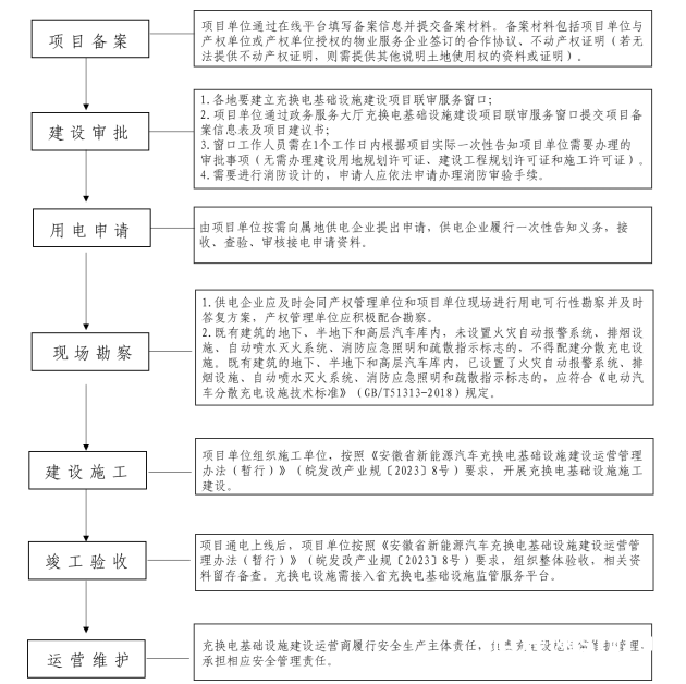 原文如下:关于进一步简化优化充换电基础设施项目备案和建设审批程序的通知市直各区县发展改革委、自然资源和规划局、住房城乡建设局、应急局,黄山高新区发改局,各区县供电公司:为进一步简化优化充换电基础设施项目备案和建设审批程序,加快构建我市高质量充换电服务体系,依据《安徽省新能源汽车充换电基础设施建设运营管理办法(暂行)》、《安徽省汽车办等关于进一步简化优化充换电基础设施项目备案和建设审批程序的通知》(皖汽办〔2024〕3号)要求,结合我市实际,现就有关事项通知如下。一、建设流程充换电基础设施项目建设流程主要包括项目选址、签订协议、项目备案、建设审批、用电报装、建设施工、竣工验收、运营维护等。部分场景充换电基础设施项目建设流程见附件1。二、优化项目备案(一)备案权限1.除高速公路服务区新建、扩建和改建充换电基础设施项目备案机关为市发展改革委外,其他充换电基础设施项目实施属地备案。2.个人在自有停车库、停车位,以及在居住区、党政机关、企事业单位的既有停车泊位,安装非运营充换电基础设施,无需办理项目备案。(二)备案材料需要备案的充换电基础设施项目通过安徽省投资项目在线审批监管平台(以下简称“在线平台”)完成项目备案,备案材料有:1.项目信息(建设规模及内容栏填写模版见附件2)。2.***项目备案承诺书(附件3)。3.项目单位与产权单位或产权单位授权单位签订的合作协议。4.不动产权证明,若无法提供不动产权证明,则需提供其他说明土地使用权的资料或证明。各区县、黄山高新区不得擅自增减审查条件,不得设置项目单位须在本地注册等有违建设全国统一大市场的备案前置条件。三、简化建设审批项目备案后,根据项目实际情况办理相关建设审批手续。(一)无新增占地的充换电基础设施项目1. 在既有停车位建设运营充换电基础设施,无需办理建设审批手续。2. 人防车位安装充换电基础设施,按照《安徽省人防工程内安装新能源电动汽车充电设施指引》(皖国动办综〔2023〕47号)执行。3. 在已出让建设用地产权红线内新建或改扩建充换电基础设施,无需办理建设用地规划许可证、建设工程规划许可证和施工许可证。4. 在新建加油(气、氢)站、燃气供配站时同步建设充换电基础设施,依法履行建设项目安全设施“三同时”手续;在既有加油(气、氢)站、燃气供配站建设充换电基础设施,需严格执行《汽车加油加气加氢站技术标准》(GB50156-2021)、《电动汽车分散充电设施技术标准》(GB/T51313-2018),并由具备资质的第三方机构出具《安全现状评价报告》备查,无需办理建设用地规划许可证、建设工程规划许可证和施工许可证。(二)新增占地的充换电基础设施项目1. 建设城市公共停车场(楼)时,无需为同步建设的充换电基础设施单独办理建设用地规划许可证、建设工程规划许可证和施工许可证。2. 以新增土地供应方式建设独立占地的集中式充换电基础设施,按照规定程序办理建设用地规划许可证、建设工程规划许可证和施工许可证。(三)配建充换电基础设施雨棚等安全防护附属设施的,无需单独报批。(四)充换电基础设施建设涉及施工临时占道、电缆管沟挖掘敷设、占用公共绿地的,参照城市基础设施建设管理,办理占破路、破绿手续。充换电基础设施项目,按照国家工程建设消防技术标准需要进行消防设计的,实行建设工程消防设计审查验收制度,依法办理消防设计审查验收(备案)手续。四、做好用电服务(一)个人在居住区的自有产权车位或经车位产权人同意、租赁期一年以上的固定车位上安装充电基础设施的,属供电企业直接供电区域的,直接向所在区域供电企业提交报装申请。(二)项目单位在完成项目备案和必要的建设审批程序后,原地址已有用电主体的以原有用电主体名义向项目属地供电企业提交增容申请,原地址无用电主体的,项目单位直接向属地供电企业提交用电申请。(三)供电企业收到报装申请后,应当主动提供用电咨询服务,履行一次性告知义务,接收、查验用电申请资料,并于1个工作日内完成业务受理。符合条件的,供电企业应及时完成供电方案答复;不符合的,应当向申请人做好解释工作。(四)供电企业应当将高速服务区充换电基础设施供电纳入配电网专项规划,满足高速服务区充换电基础设施项目建设电力需求。(五)供电企业负责充换电基础设施从产权分界点至公共电网的配套接网工程。(六)非电网直接供电区域供电主体应同步参照执行。五、强化运行保障(一)建立联审机制。各区县、黄山高新区要建立发展改革、自然资源、住房城乡建设、应急等有关部门紧密配合的高效联审机制,明确充换电基础设施建设审批流程,编制服务指南。在各地政务服务大厅设立充换电基础设施建设项目联合审批服务窗口,集中职能审批事项,实现“一口受理、并联审批、限时办结”。(二)压实各方责任。发展改革部门要牵头做好充换电基础设施项目备案和建设审批程序简化优化工作;交通运输部门要支持高速公路服务区充换电基础设施项目建设;自然资源部门要进一步加强充换电基础设施用地保障;住房城乡建设部门要协调推进住宅小区充换电基础设施建设工作;电力部门要加强充换电基础设施项目建设用电需求保障;消防救援部门、城市管理部门要支持配合做好