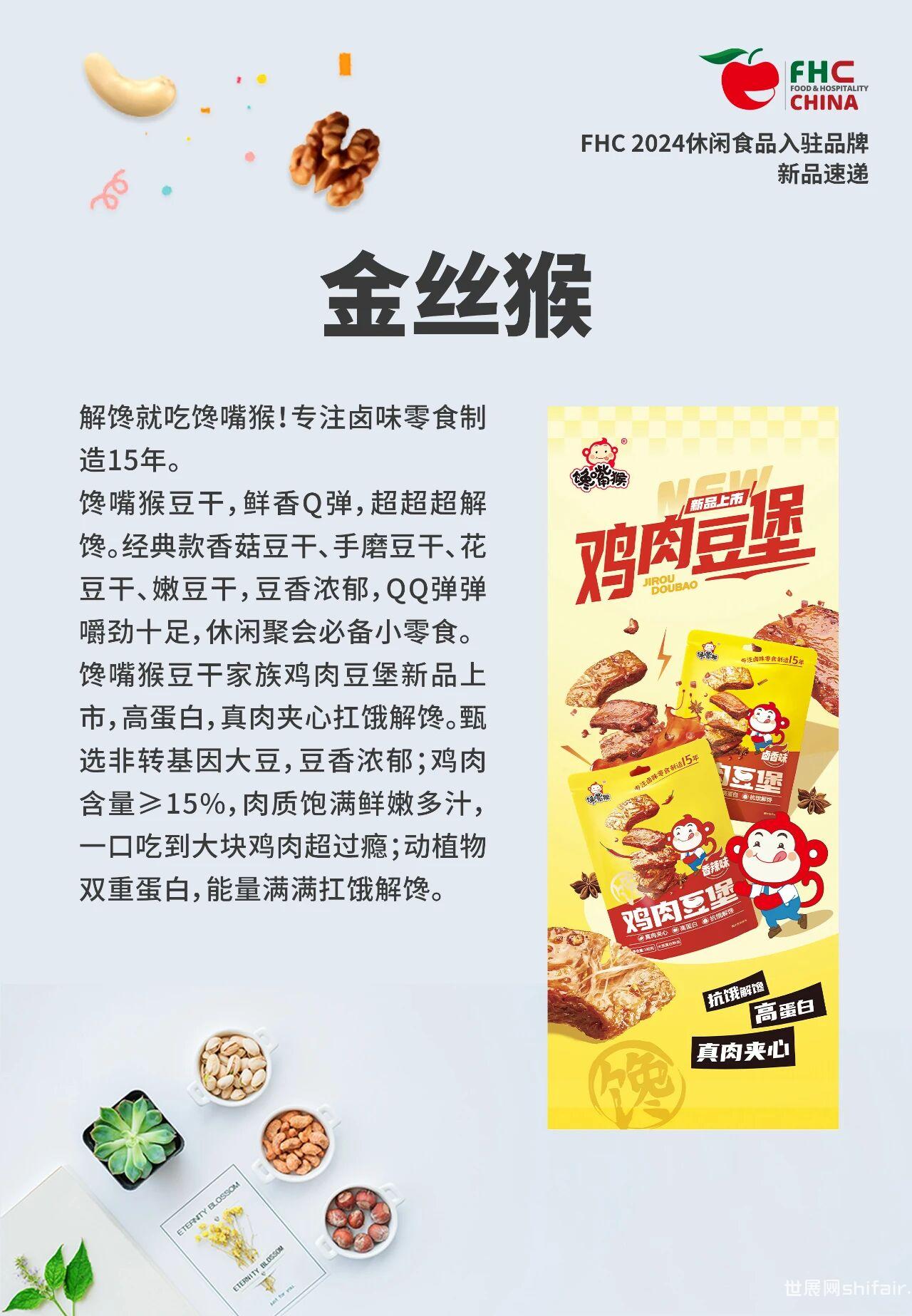 金丝猴、优鲜沛、臻味、角力士等休闲食品品牌已确认入驻第二十七届FHC上海环球食品展,缤纷产品抢先看!休闲食品板块展出包含:豆制品,素食蔬果,果冻,果脯蜜饯,西式甜点派,膨化食品,肉禽类零食,水海产品类零食等品类。 国际化视野:汇聚全球食饮商资源,带来世界前沿创新产品和贸易机会。链接专业买家:100万行业数据库,专业买家来自苏宁、沃尔玛、美宜佳、万达集团、京东、阿里、永辉超市、盒马等知名企业,覆盖商超、零售、团购、商旅文娱等领域。 展会规模:20万平方米展出面积,50+参展国家和地区,3000+参展企业,触达17万+专业买家。FHC2023累计媒体曝光超1亿。 高峰论坛:与名企面对面,邀请行业领袖、学者分享前沿洞见。 王牌赛事活动:烹饪、烘焙、咖啡、潮饮等热门领域赛事,汇聚行业精英,拓展行业边界。 展会时间:2024年11月12-14日 展会地点:上海新国际博览中心扫描或识别图中二维码,快捷预订展位&领取观展门票! 相约FHC2024,品全球美味,话产业未来!展位咨询:Owen Hong 洪先生TEL:(86)E-mail: Owen.市场合作:Flora Tao 陶女士TEL:(86)E-mail: Flora.
