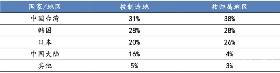按照制造地划分,2019年中国台湾、韩国和日本分别占比31%、28%和20%,合计份额79%;中国大陆占比16%。不过大陆产能绝大部分为日韩台厂商投资建设,所以如果按厂商归属地标准划分,中国大陆产能占比仅为4%,远低于按归属地划分占32%份额的整体PCB行业。IC载板全球产能分布情况
