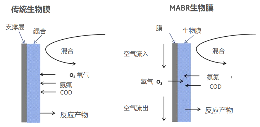黑斯佩勒厂概览黑斯佩勒污水处理厂始建于1973年,并于1988年和1992年两次升级改造。新的MABR工艺于2021年投入使用,旨在满足不断增长的人口需求,服务于居民和工业部门。该污水厂使用了MABR技术,相较于传统的污水处理方法,是一个重大的飞跃。MABR技术MABR全名是膜传氧生物膜反应器(membrane aerated biofilm reactor),是一种基于氧气/空气的MBfR工艺。MBfR指的是基于膜传导的生物膜反应器 (MBfR- membrane biofilm reactor)。这个工艺的一大优势是其设计的多样式。该系统里气体的通过膜(管式、中空纤维、平板)输送至液相,生物膜生长在膜的外表面。▼MABR的逆扩散传质原理图