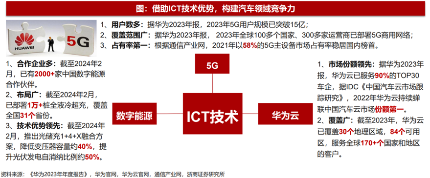 - ICT技术优势:华为在5G、华为云、数字能源等关键领域展现出全球领先地位。截至2023年底,华为在全球范围内拥有超过15亿的5G用户,华为云服务于国内90%的TOP30车企。