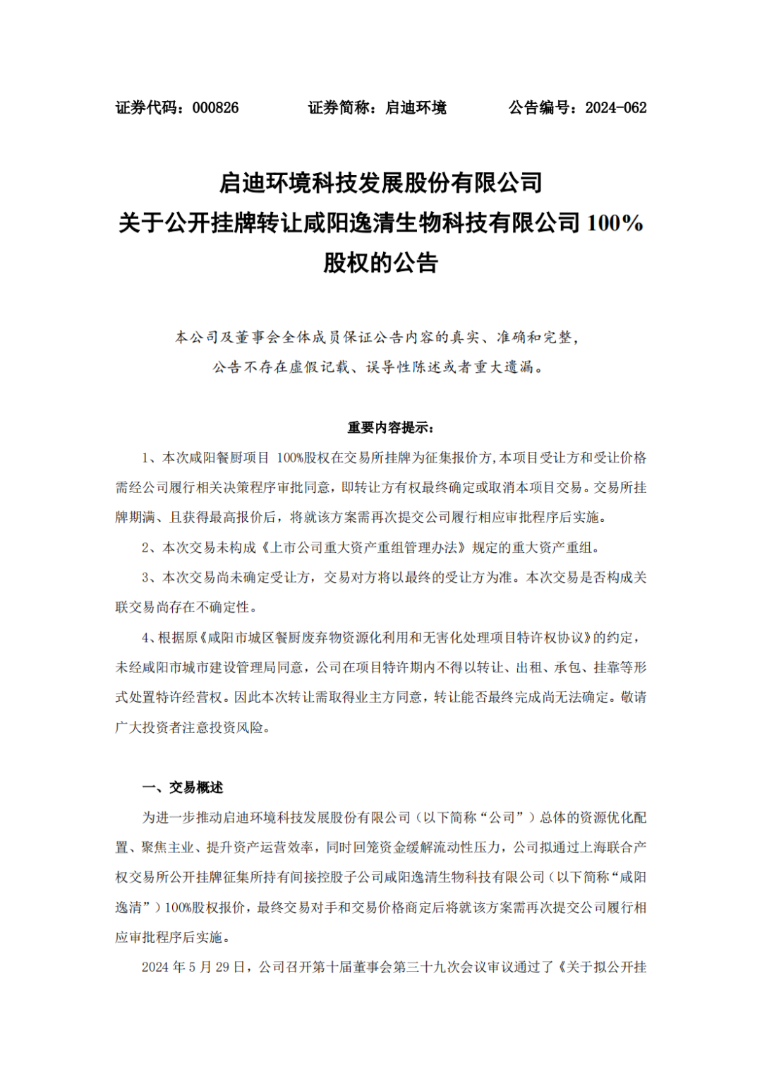 启迪环境5月31日发布公告称,为进一步推动公司总体的资源优化配置、聚焦主业、提升资产运营效率,同时回笼资金缓解流动性压力,公司拟通过上海联合产权交易所公开挂牌征集所持有间接控股子公司咸阳逸清生物科技有限公司100%股权报价。据悉,启迪环境于2014年7月与咸阳市城市建设管理局共同签署了《咸阳市城区餐厨废弃物资源化利用和无害化处理项目特许权协议》,协议约定将咸阳市城区餐厨废弃物资源化利用和无害化处理项目的投资、建设、运营和维护取得餐厨废弃物处理服务费的特许权授予公司,项目处理量为100吨/日,特许经营期限为25年(含建设期),公司设立了咸阳逸清从事该项目的投资、建设及运营。