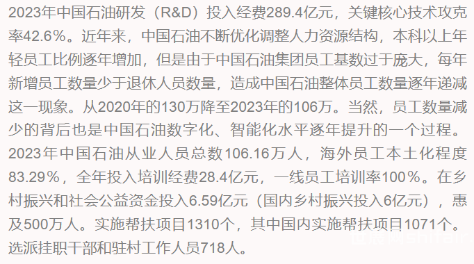 玉门油田30万千瓦光伏发电示范项目并网发电中国石油在2023年取得了显著的经济、社会和环境业绩。积极响应国家能源转型战略和低碳发展要求,加大在新能源、新材料和生态环境保护方面的投入和力度;同时,也积极履行社会责任、推动乡村振兴和社会公益事业发展;在员工培训和发展方面也取得了积极进展。这些业绩和举措不仅展示了中国石油的实力和担当精神,也为其未来的发展奠定了坚实基础。