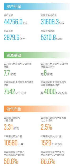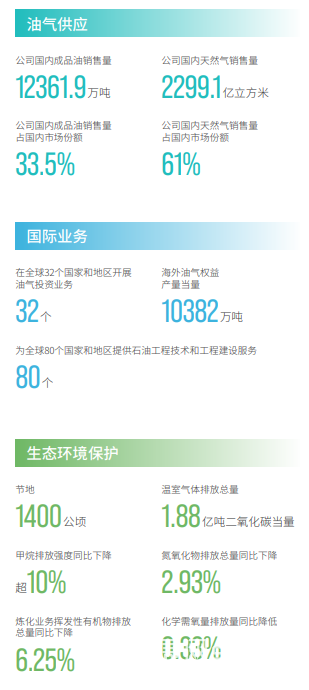 2023年中国石油国内新增探明石油地质储量7.7亿吨,国内新增探明石油地质储量连续18年超6亿吨,国内新增探明天然气地质储量7542亿立方米,国内新增探明天然气地质储量连续17年超4000亿立方米。在油气产量方面,中国石油国内外油气产量当量3.31亿吨,国内外油气产量当量比上年增长2.5%,国内原油产量10580万吨,国内天然气产量1529亿立方米,国内原油产量占全国原油总产量份额50.6%,国内天然气产量占全国天然气总产量份额66.6%。在油气供应方面,中国石油国内成品油销售量12361.9万吨,国内天然气销售量2299.1亿立方米,国内成品油销售量占国内市场份额33.5%,国内天然气销售量占国内市场份额61%。在国际业务方面,中国石油在全球32个国家和地区开展油气投资业务32个,海外油气权益产量当量10382万吨,为全球80个国家和地区提供石油工程技术和工程建设服务80个。在生态环境保护方面,中国石油节地1400公顷,温室气体排放总量1.88亿吨二氧化碳当量,甲烷排放强度同比下降超10%,氮氧化物排放总量同比下降2.93%,炼化业务挥发性有机物排放总量同比下降6..25%,化学需氧量排放量同比降低0.33%。