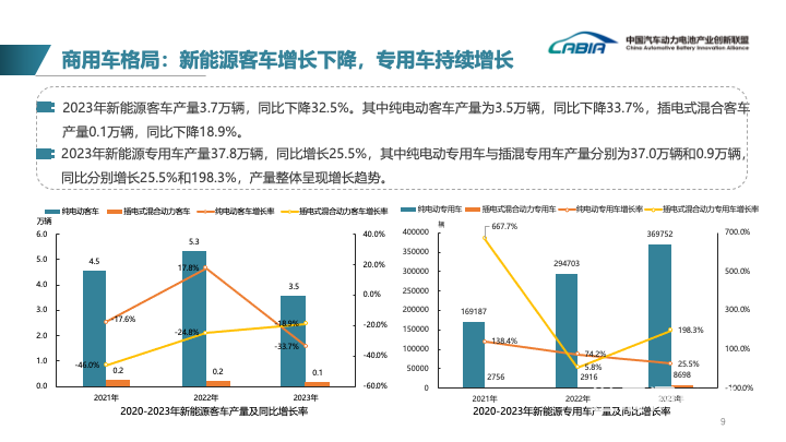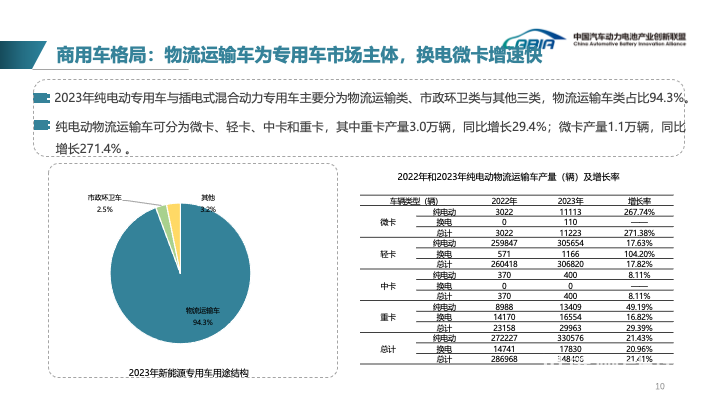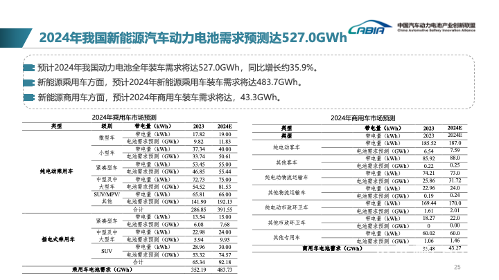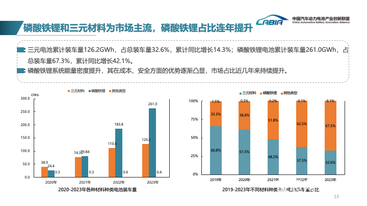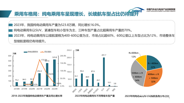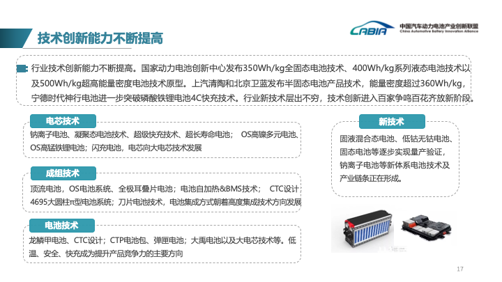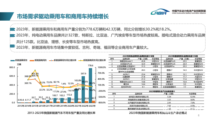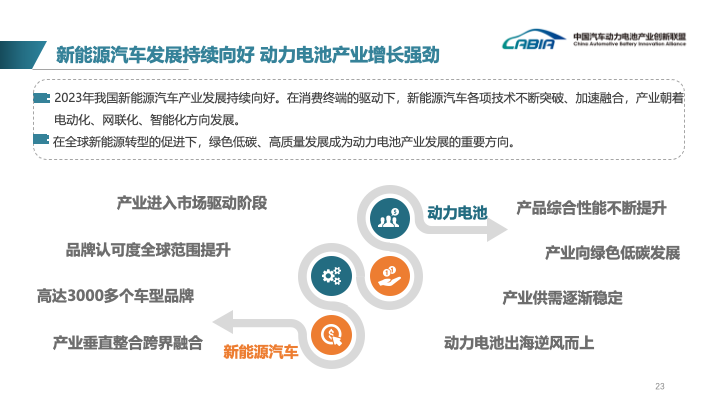 近日,中国动力电池产业创新联盟(下称“创新联盟”)发布《2023-2024年中国汽车动力电池及氢燃料电池产业发展年度报告》,深入分析了当前新能源汽车和动力电池产业的运行特点,并展望了2024年的发展趋势。随着全球新能源汽车产业的快速发展,中国汽车动力电池及氢燃料电池产业也迎来了新的发展机遇。新能源汽车产业已经进入市场驱动阶段,品牌认可度在全球范围内提升。2023年,中国新能源汽车市场持续增长,中国新能源汽车销量占全球市场份额的66%。我国燃料电池汽车销量也在2023年达到7979辆,同比增长45%。在市场需求的驱动下,乘用车和商用车齐头并进,呈现出持续增长、多点开花的发展特点。2023年,国内共发布了财税优惠和非财税类相关政策110条。在政策的大力支持下,动力电池产业在综合性能、绿色低碳发展、供需链稳定以及出海能力方面展现出强劲的发展势头。我国动力电池产、销分别完成了664.7GWh和616.3GWh,装车量387GWh,在全球占比超过五成。磷酸铁锂与三元电池在安全、性能等方面进一步突破,钠电、半固态电池开始应用装车,产业布局进一步完善,全球化发展态势明显。亚洲、欧洲和北美地区均有企业积极布局,据不完全统计,在欧洲已有42家动力电池企业进行了布局,亚洲地区则有55家企业,北美地区有28家。展望2024年,新能源汽车发展持续向好,动力电池产业增长强劲。在全球新能源转型的促进下,绿色低碳、高质量发展成为动力电池产业发展的重要方向。