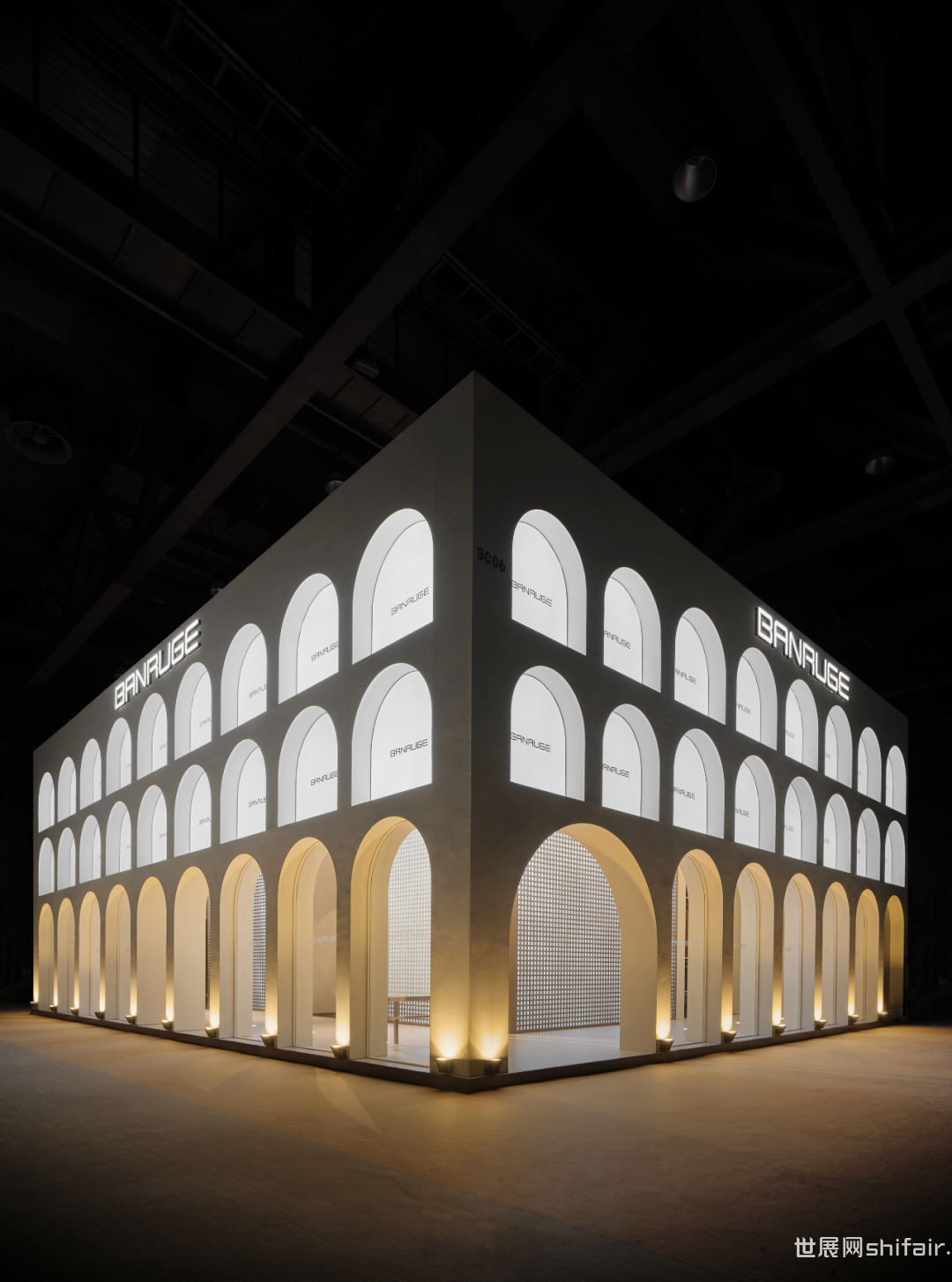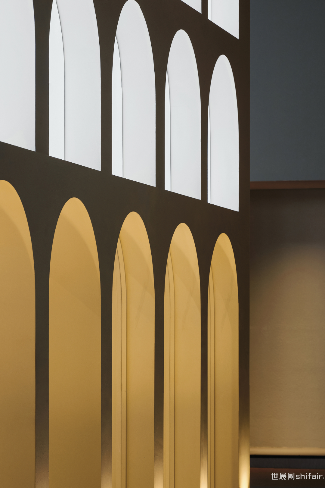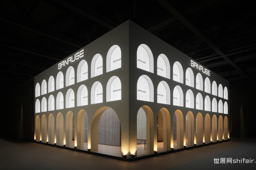 2023的广州设计周无疑又是一次视觉与思想的双重突破,众多的展厅呈现出的缤纷设计盛宴中,班鲁格展厅以其独特的古罗马意式美学外型脱颖而出。整个展厅以纯白水泥、欧式拱廊架构屹立,三层连列圆拱小券光影明朗,呈现出壮阔朝圣般精神指引。建筑不语,却吸引观者不由自主流连忘返,探寻隐藏于结构美学背后的东方智慧。