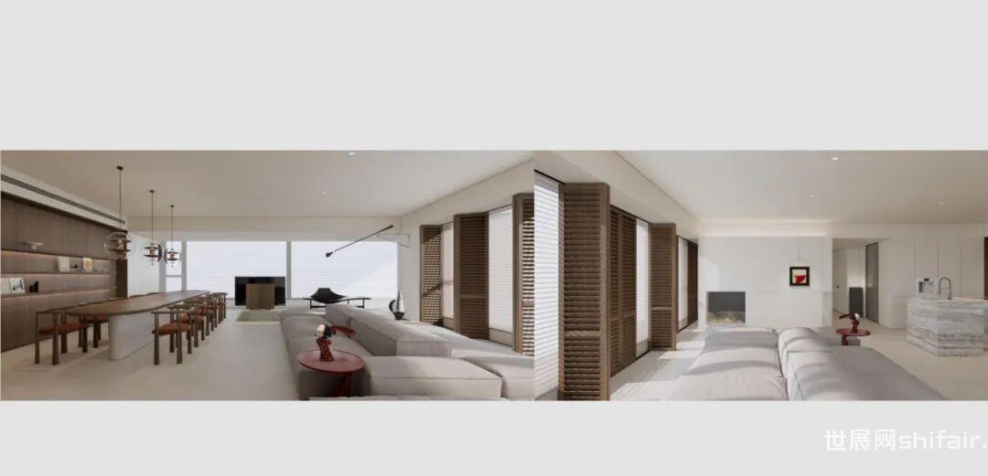 在疫情前跟疫情后离婚率差别很大,因为很多人在家没有办法点外卖,全部都是靠厨房这一个功能去满足两个人的交流,所以厨房这个重要性就被完全体现出来。它承接了客厅餐厅还有厨房的功能,其实我们岭南厨房肯定是有油烟的。所以封闭式也必须需要的。所以呢他是做了一个折叠门去让这个空间容纳到餐厅,也跟厨房去进行一个空间的融合。并且它可以跟外界建设起一个联系,接着这个项目他就可以满足业主当下的需求.我觉得有一句话很重要:想要婚姻过得好,厨房一定不能少。