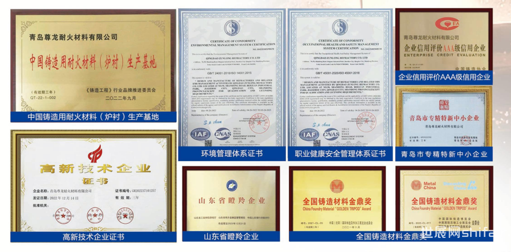 良心+匠心+恒心=尊龙品牌!公司长期专注于中频感应炉耐材领域,走"专精特新"的发展道路。公司先后获得国家级“高新技术企业”、省级“专精特新技术企业”和“山东省瞪羚企业”“两项发明专利及二十九项实用新型专利”,入选青岛市科技型企业库等荣誉;尊龙耐材还是全国唯一一家被中国铸造协会授予“中国铸造用耐火材料生产基地”的企业,同时荣获多项产品的“全国铸造材料金鼎奖”荣誉。公司还作为主要起草单位牵头制定了《中频无芯感应电炉用干式炉衬料》团体标准。