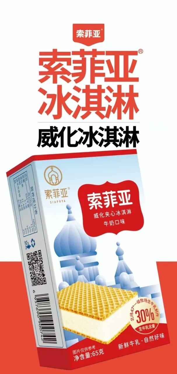 索菲亚威化冰淇淋于2017年开发上市,一直深受消费者的喜爱。产品采用特制的双层威化薄饼,夹心牛奶口味冰淇淋。手工烤制威化饼具有酥脆的口感,清新微甜的小麦香、与北纬47°黄金牧场、6小时锁鲜的生牛乳制成的冰淇淋融为一体。浓郁的奶香、甜感温和、香而不腻。该产品是一款值得慢慢品味的优质冰品,更是目前国内同类产品的典范。