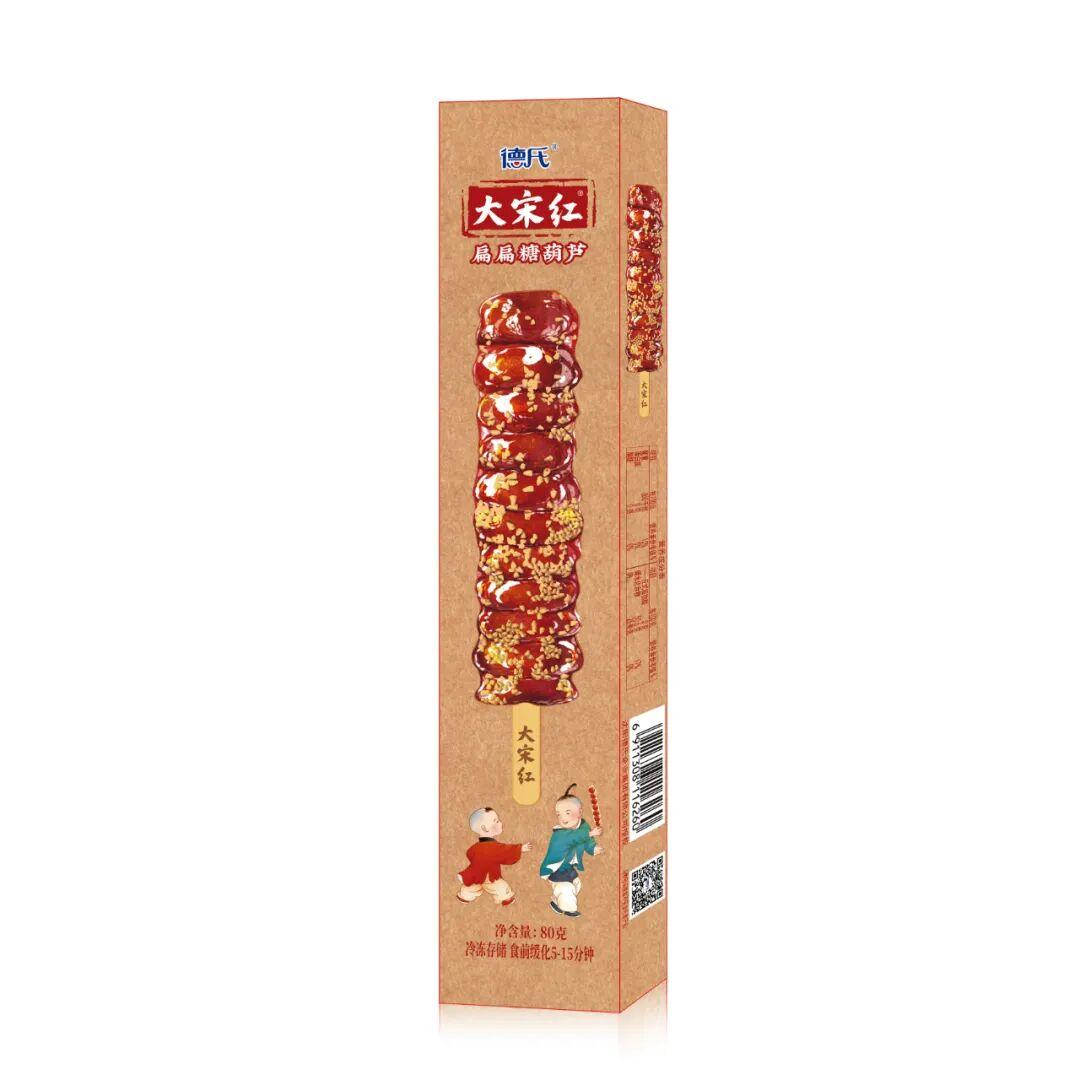 香浓巧克力脆皮邂逅香酥甜筒碎,与清新丝滑的香草雪糕完美融合,每咬一口都是层次丰富、香脆爽口的美妙体验。独特的锦鲤造型,不仅栩栩如生、活泼可爱,更蕴含着美好的寓意,祝福每位品尝者锦鲤附体,好运连连。08沈阳德氏冷饮食品有限公司Shenyang Deshi Cold Drink Food Co., Ltd.扁扁糖葫芦Bianbian Tanghulu .