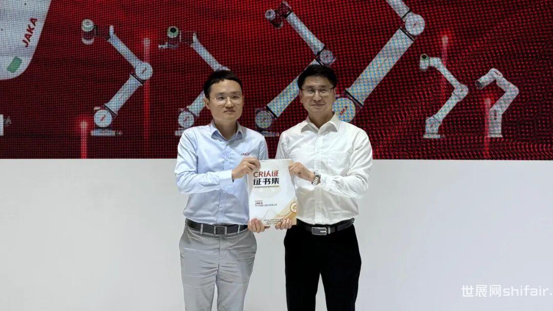 在“新品空间站”内,除却JAKA MAX 40重负载机器人,JAKA A系列、JAKA S系列机器人以及JAKA Zu 20机器人等新产品家族成员,与Web端极简示教Coboπ平台、Lens视觉感知系列“珠联璧合”,全方位体现了节卡机器人在灵活感知、智慧决策、精准执行、能效管理、自主学习等方面技术积累。 左:节卡机器人产品总监 朱春晓   右:上海机器人产业技术研究院常务副院长 柴熠凭借过硬的产品技术实力,节卡机器人全系列产品获得CR认证*。国评中心(总部)主任郑军奇先生为节卡机器人颁发权威认证“001”号证书,祝贺节卡机器人成为国内首家协作机器人产品在满足安全、EMC的基础上,同时通过CR认证四大专业技术方向(分别为:可靠性、信息安全、功能安全和智能水平)认证的企业。其中,节卡机器人全系列产品达到功能安全方向最高水平等级L5。10年来,凭借各类认证与实际应用需求的深刻洞察,节卡机器人已积累大量的“001”号证书,是国内率先获得SGS TüV-Saar功能安全证书的企业,同时也是是业内第一家涉足MTBF认证的协作机器人企业。未来,节卡机器人将始终对标权威第三方认证,以客观公正的数据证明产品品质,增强产品的透明度与公信力。节卡机器人始终怀抱“解放人类双手,点亮智慧火花”的使命,以系统化的引入策略培养人才储备军,延续产品创新能力,以可持续经营体系、大客户战略推动公司健康、高速发展,冲刺资本市场。