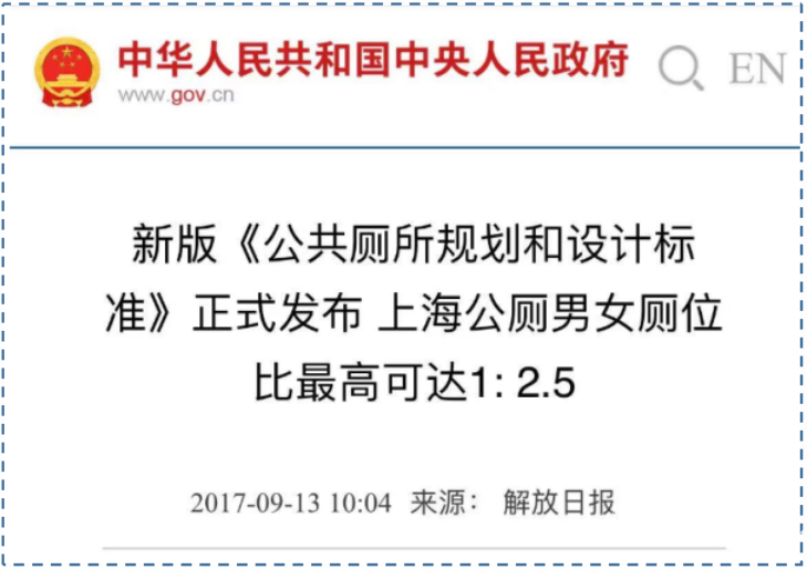 该标准规定,时段性客流特征明显、负荷大的公厕,男女厕位比例宜为1:2.5,或宜设通用厕间(即无性别厕间)。