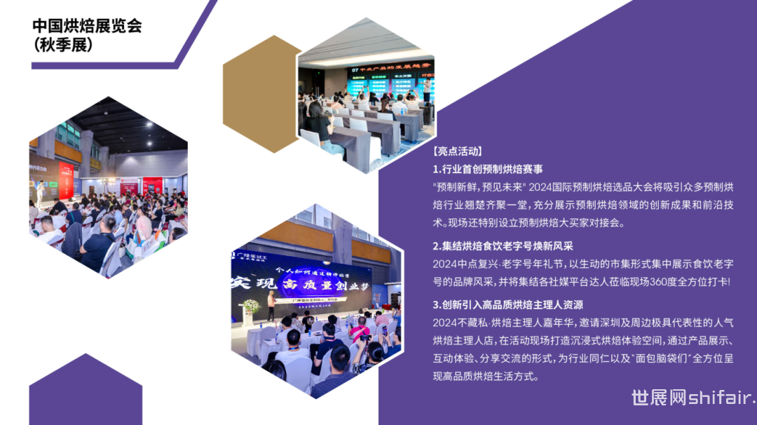 -BAKERY TIME-2024中国烘焙展览会(秋季展)作为烘焙行业首个创新精品展,在年度收官之际,承上启下以”烘焙+”、“节日节令”为主题,为行业盘点大烘焙元年新商机,汇聚预制烘焙、节日节令烘焙、新质烘焙等优质资源,助力华南地区的参展商向全国传递鲜明新形象,即华南地区不仅是高性价比先锋,更是高产品附加值与高品牌附加值的高端产业链集中地,一场集展+市+秀+会+赛+品的烘焙食饮盛典!将聚焦年底年礼市场,探索商贸新模式,赋能品牌新增长,抢占烘焙+年礼新商机!