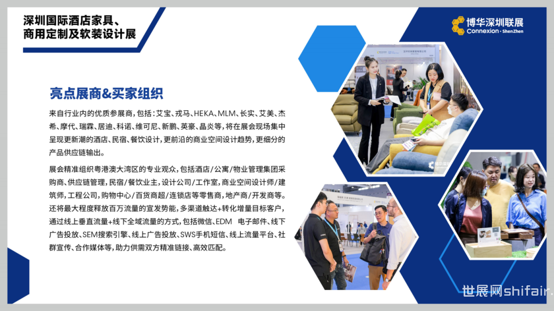 在这一背景下,Hotel&Shop Plus深圳国际酒店及商业空间博览会作为博华深圳联展旗下系列展之一,在2024年12月12日-14日汇聚来自建筑装饰材料、天然石材、人造石材、石材工艺、岩板、石材养护、酒店用品及布草、智慧酒店、照明灯饰、商用机器人、店铺设计及装修、酒店家具、酒店加盟、餐饮等丰富品类展商,组成超30万㎡的线下一站式采购平台。