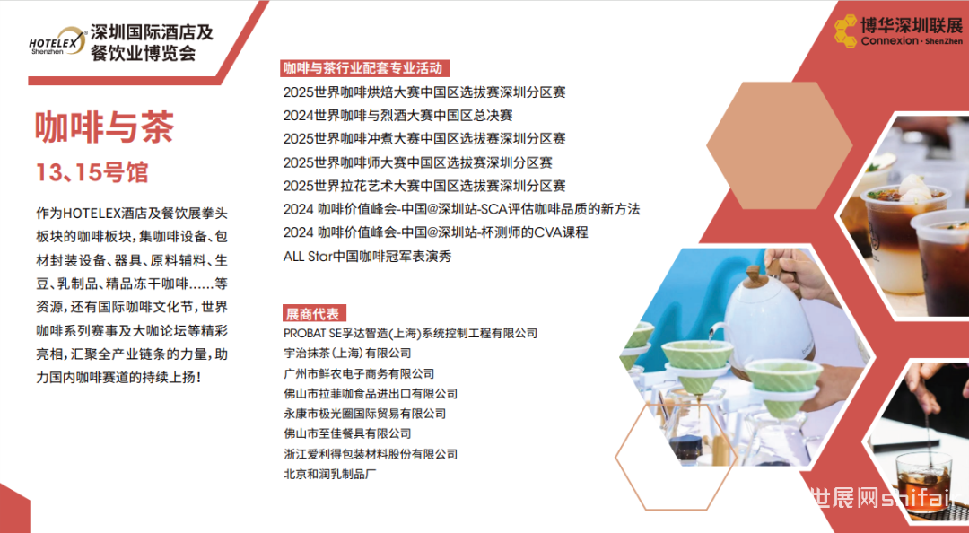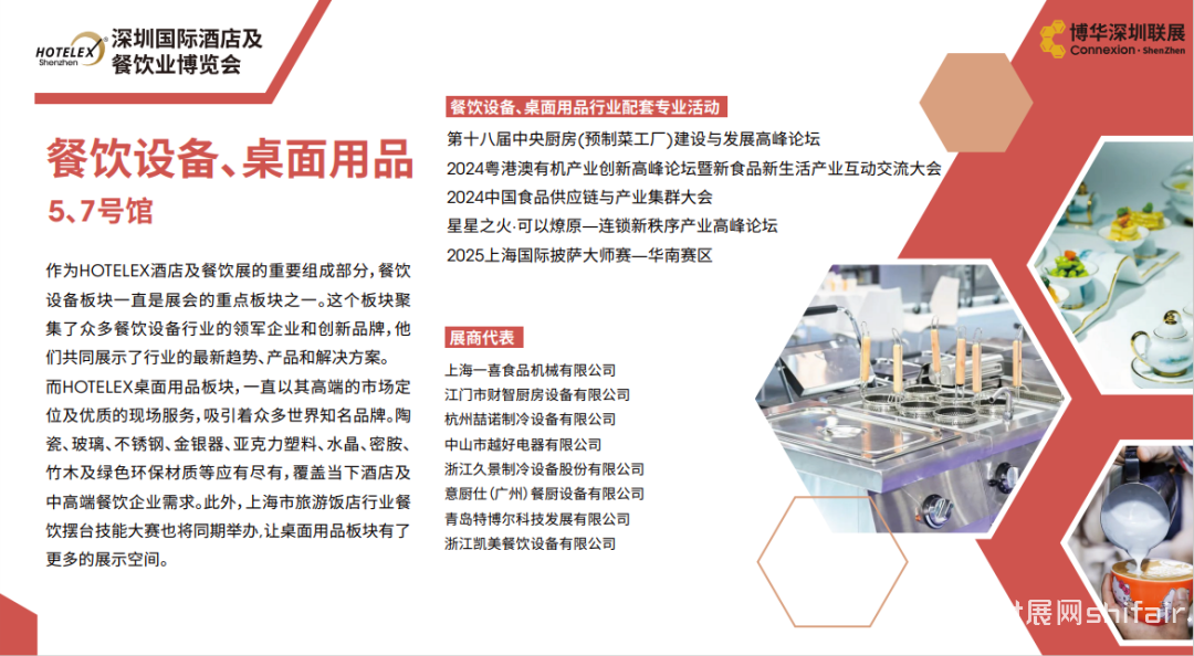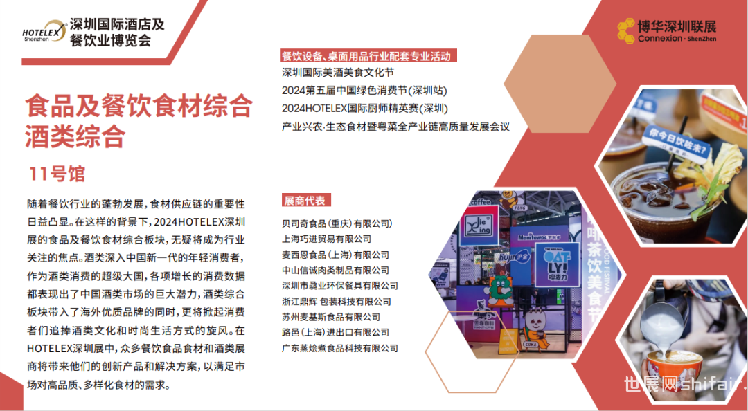 2024深圳国际酒店及餐饮业博览会将汇聚咖啡与茶、饮品综合、食品及餐饮食材综合、餐饮设备、桌面用品、烘焙甜点及轻餐、连锁加盟及连锁资源、酒类综合和礼品及生活方式九大板块的优质资源,汇聚了全球顶尖的供应商和前沿产品,为您呈现出一场酒店餐饮行业盛宴!